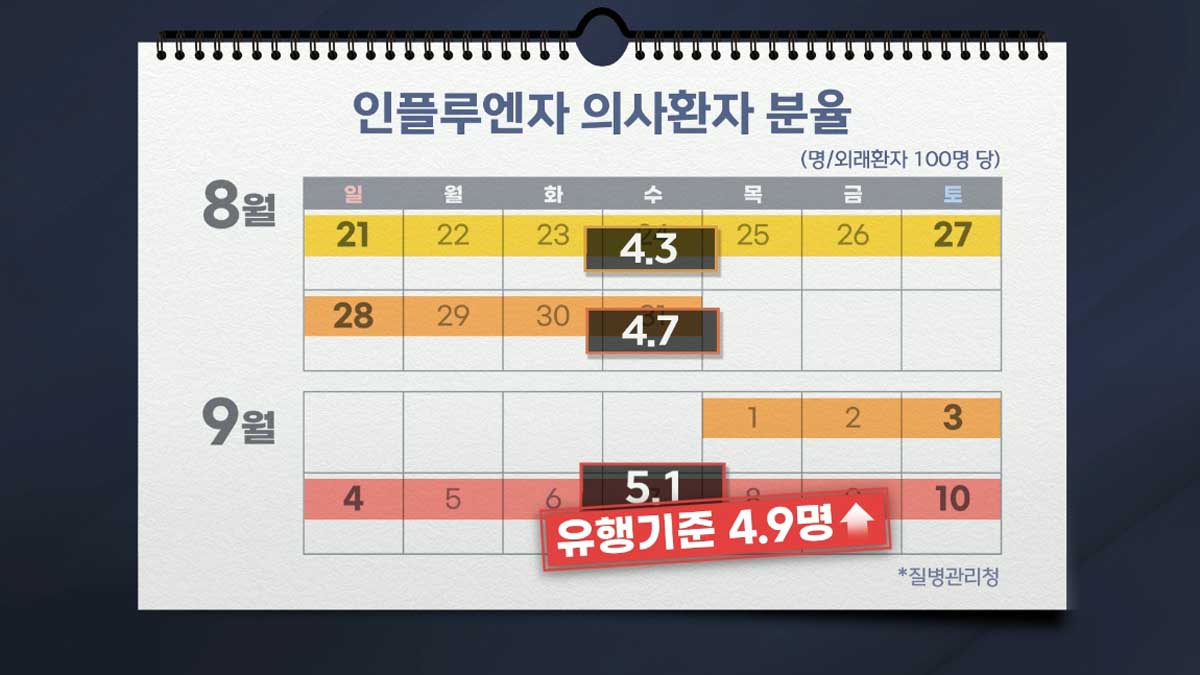 지난 7월 말 이후 늘고 있고 유행기준 4.9명을 넘어서 3년 만에 인플루엔자 유행주의보가 내려졌습니다.