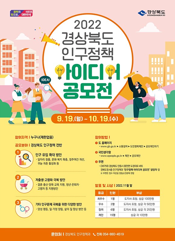 경상북도가 인구를 늘릴 다양한 아이디어를 공모합니다.