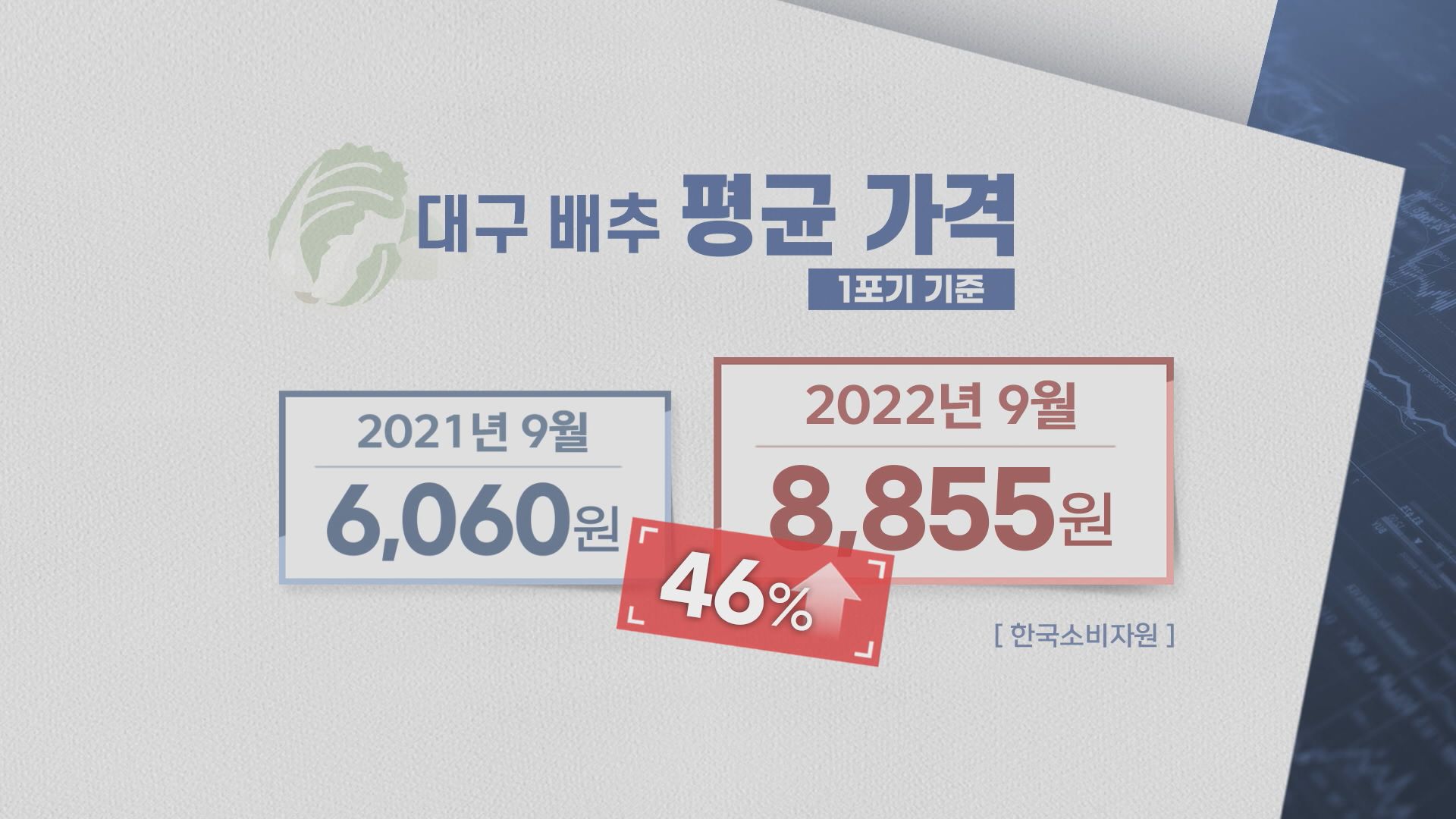 한국소비자원 가격정보 종합 포털인 참가격에는 9월 현재 대구의 배추 한 포기 평균 가격은 8,855원입니다.