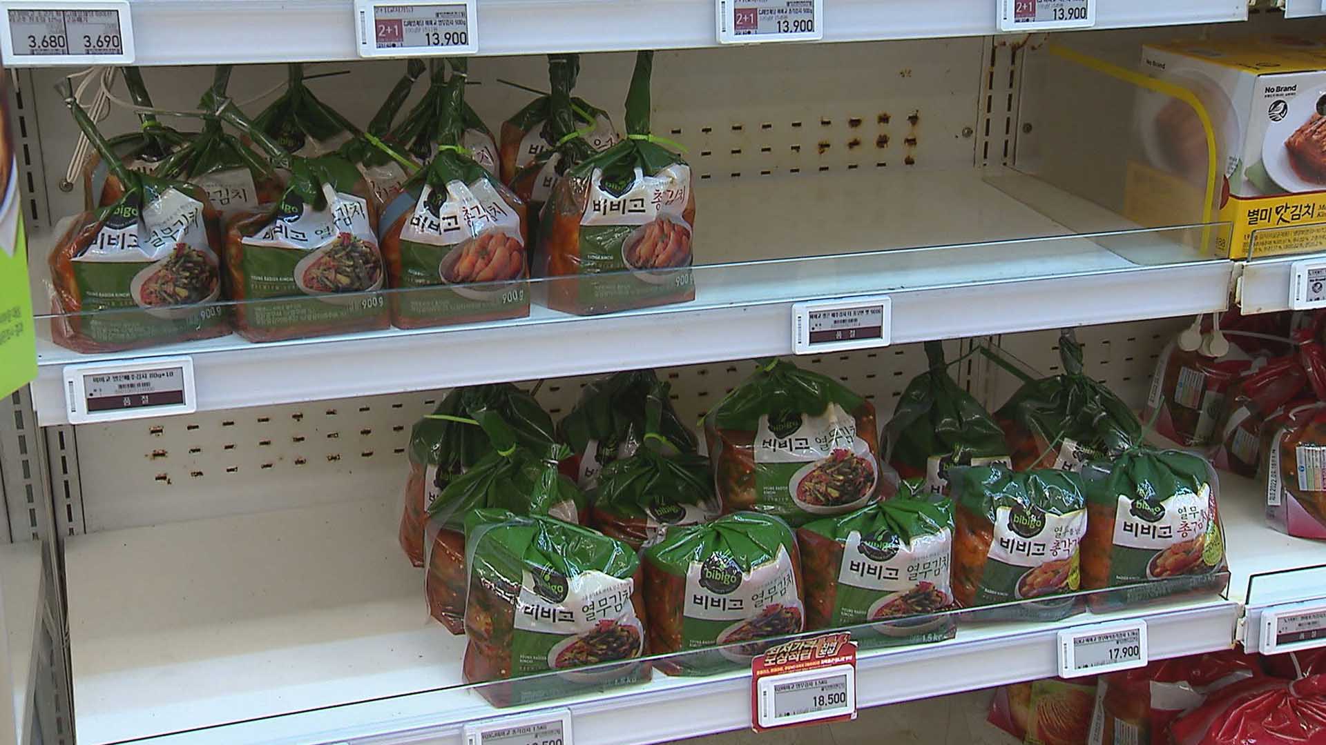 대형마트 포장김치 코너에는 일부 품목은 수급에 차질을 빚으면서 품절 사태까지 벌어지고 있습니다.
