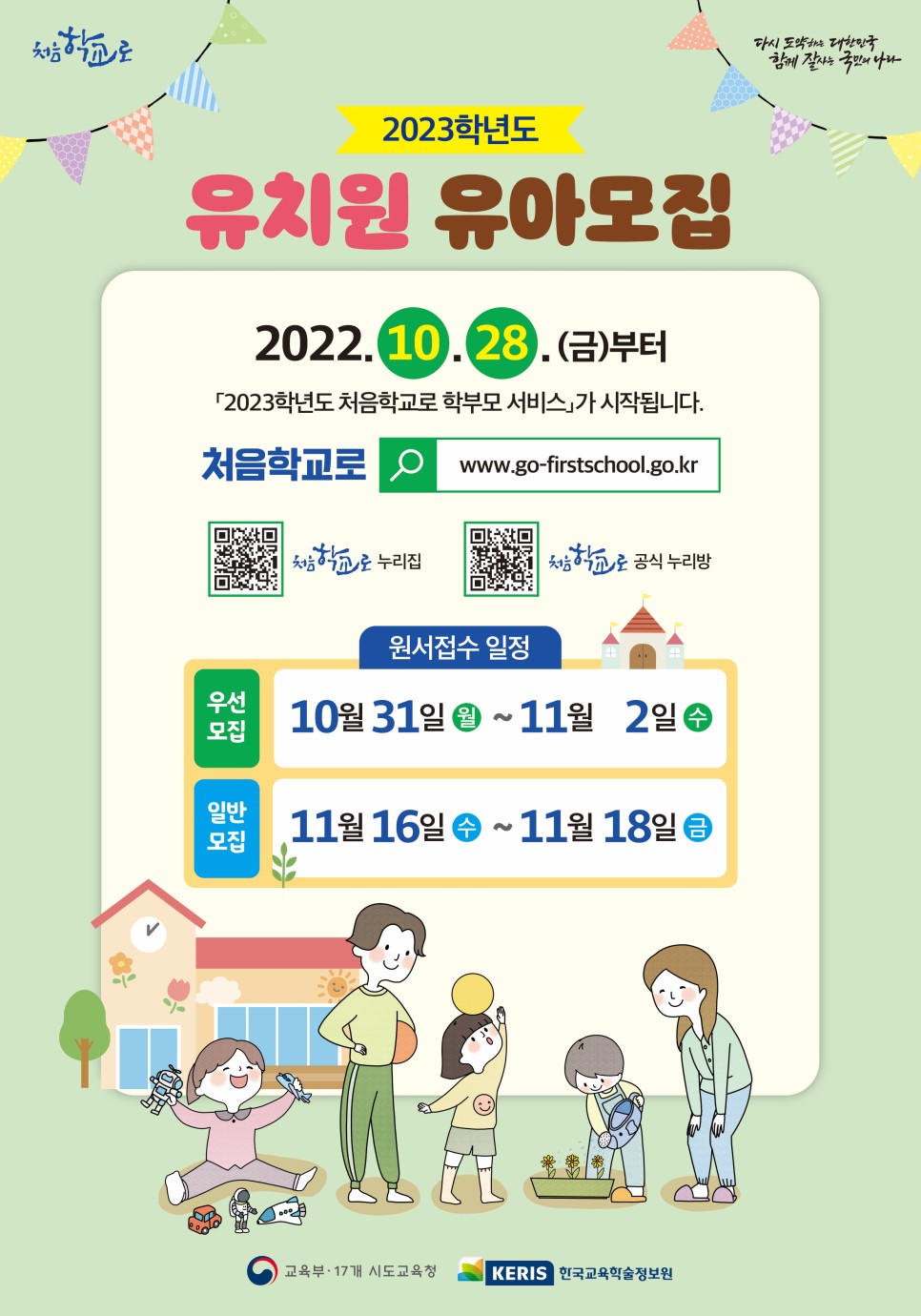 2023년 모집 유아는 2017년부터 2019년까지 출생한 유아로 우선모집, 일반모집, 추가모집 3단계로 이뤄집니다.