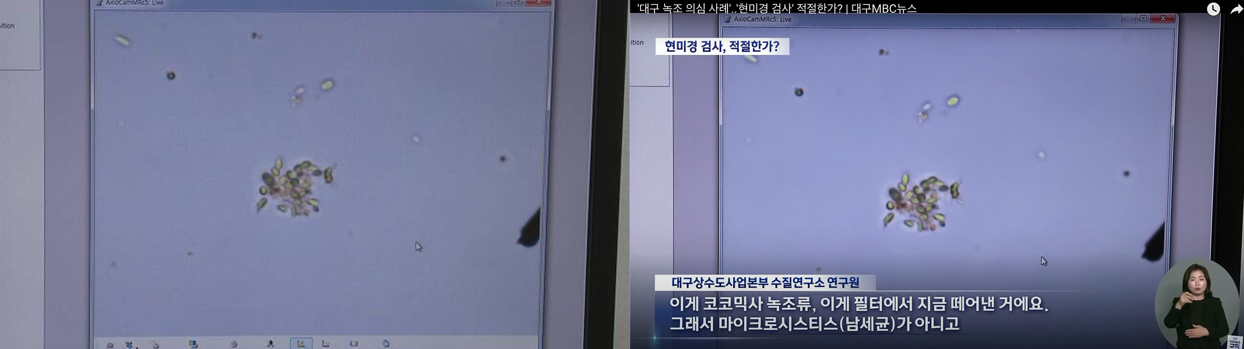 이 사진은 대구MBC가 10월 18일 '대구시, 현미경 검사하고 "인체에 무해한 녹조류"?'라는 제목으로 보도한 리포트 중 한 장면입니다. 자막에서도 보이듯 '대구상수도사업본부 수질연구소 연구원'의 설명이 나옵니다. 즉 이 사진은 대구시 상수도사업본부가 녹조 의심 사례로 직접 신고받은 대구 달성군 가정집의 수돗물 필터를 '현미경'으로 조사한 결과인 겁니다.