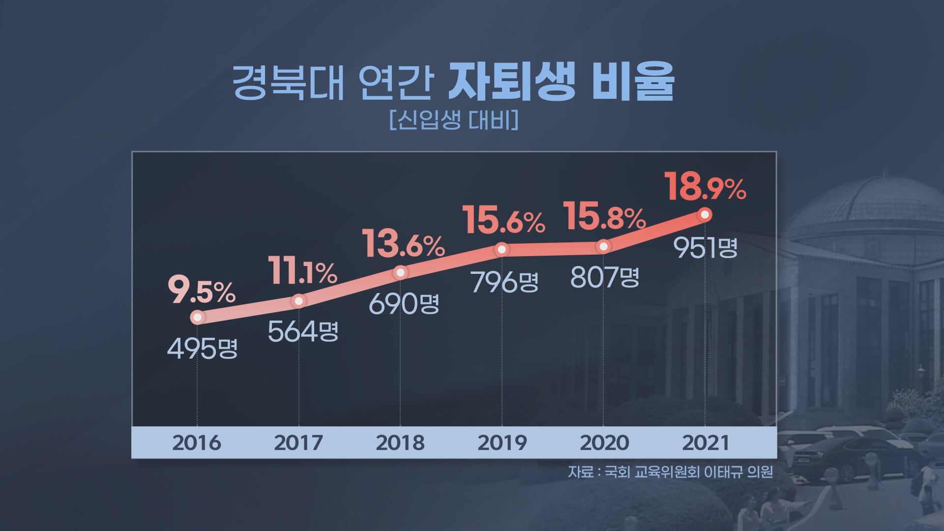2021년 기준으로 9개 거점국립대 가운데 자퇴 비율은 경상대가 20.3%로 가장 높았고, 강원대도 19.4%로 경북대보다 높았습니다.