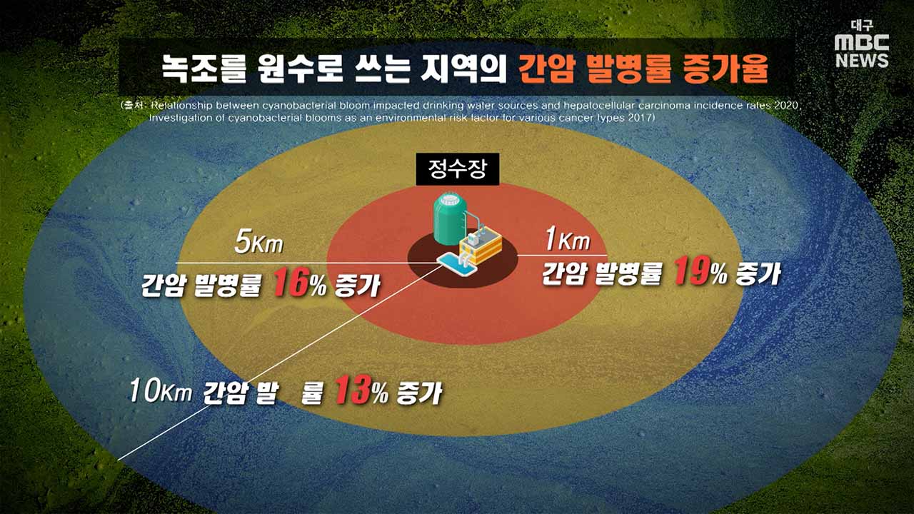 강찬수 중앙일보 기자 "이지영 교수 연구팀이 실시한 2015년도 또 다른 조사 결과를 보면 남조류 발생 면적이 1% 증가할수록 비알코올성 간 질환 사망률이 0.3% 증가하는 걸로 나타났습니다. 2020년 발표한 논문에서는 녹조가 발생한 물을 상수의 원수로 사용하는 지역과 녹조가 발생하지 않는 물을 상수 원수로 쓰는 사람들과 비교를 했을 때, 녹조가 있는 물에서 1km, 5km, 10km 떨어진 지역을 대상으로 조사한 결과 비알코올성 간세포암 발병률이 각각 19%, 16%, 13%로 녹조가 있는 물에 가까울수록 더 높게 나왔어요. 1km라고 해도 굉장히 먼 거리인데, 19%면 굉장히 높은 거죠. 녹조가 나온 강 인근에서는 녹조가 발생하지 않는 물을 상수 원수로 쓰는 사람들보다 간세포암 발병률이 더 높을 거라는 것을 추정할 수 있습니다"