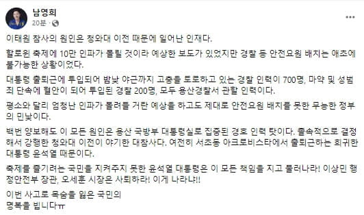 '이태원 압사 참사'와 관련해 더불어민주당 남영희 민주연구원 부원장이 “청와대 이전 때문에 일어난 인재”라는 글을 SNS에 게시했다가 삭제했습니다.