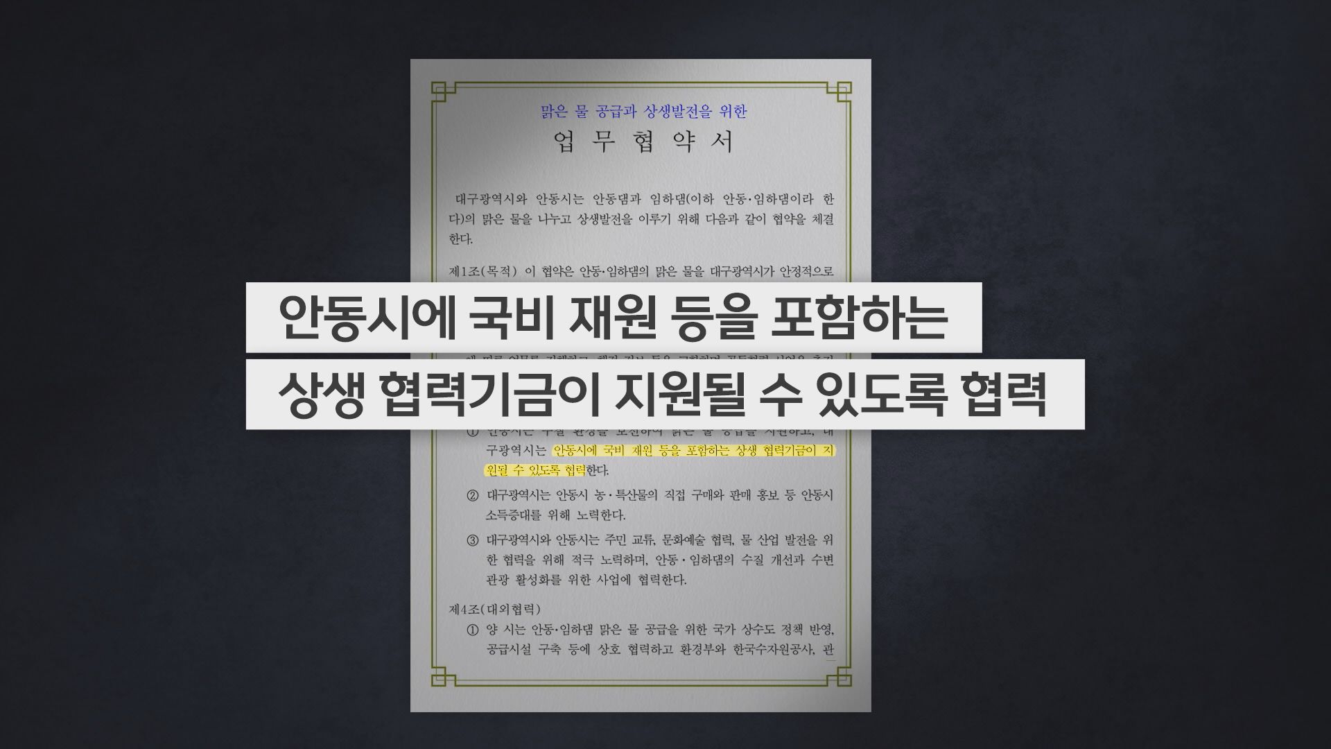 안동댐과 임하댐 물을 대구 시민 식수로 공급하는 내용의 협약서에 오늘 대구시장과 안동시장이 사인했습니다.