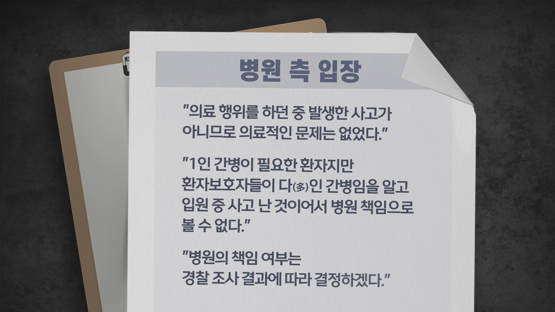 하지만 병원 측은 의료행위를 하다가 발생한 사고가 아니어서 의료상의 문제는 없었으며 숨진 환자의 경우, 1인 간병이 필요한데도 병원이 다인 간병 시스템인 사실을 알고 입원한 것이어서 병원의 책임으로 볼 수 없다고 밝혔습니다.