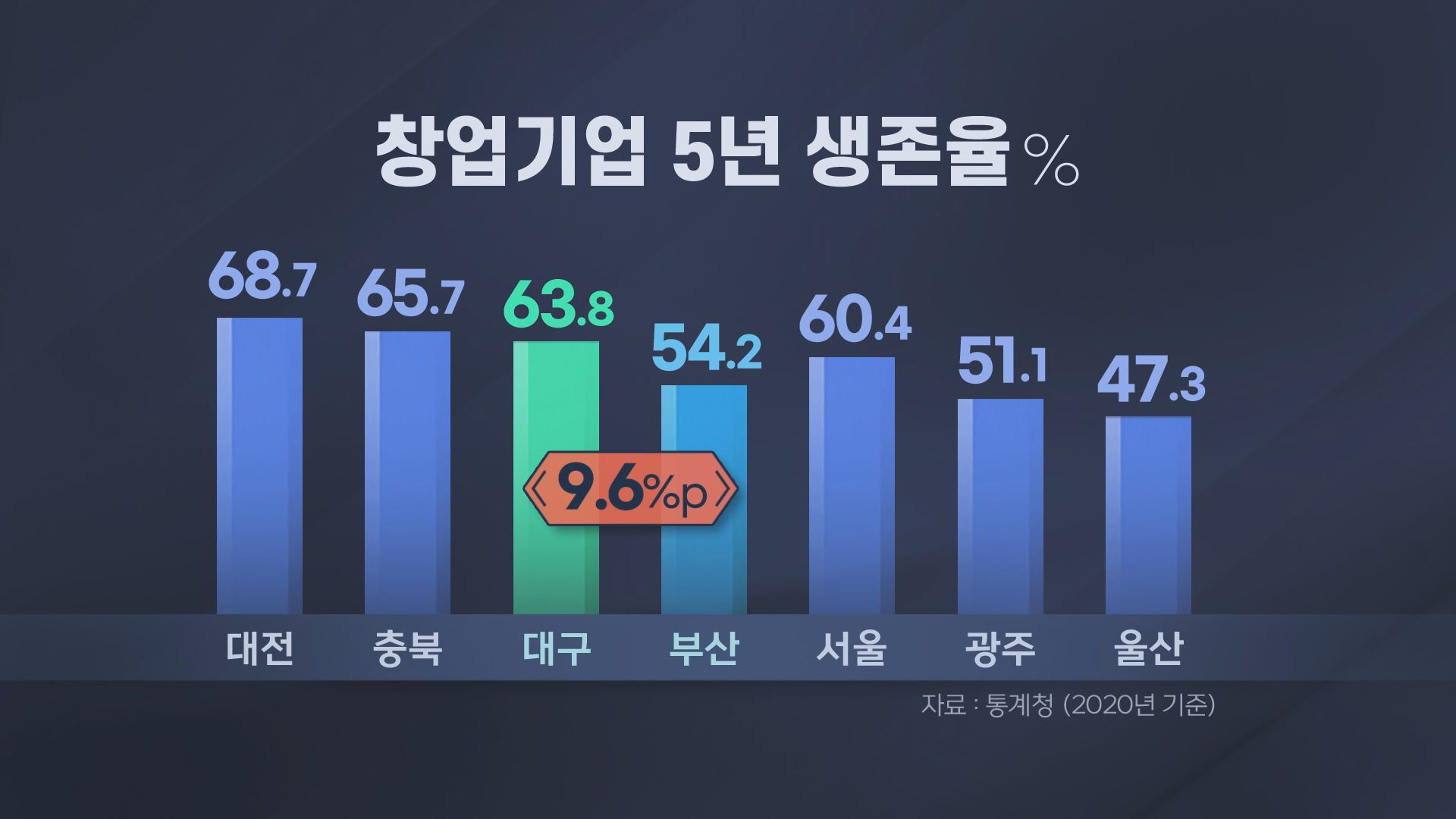 통계청에 따르면 2020년 기준 대구 창업 기업의 5년 생존율은 63.8%로 54.2%인 부산보다 10% 포인트 가까이 높습니다.