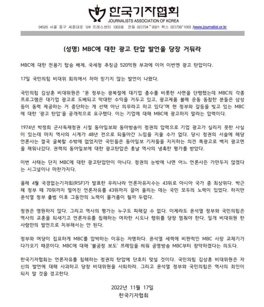 한국기자협회는 "정권은 영원하지 않다. 그리고 역사의 평가는 누구도 피해 갈 수 없다. 이제라도 윤석열 정부와 국민의힘은 역사의 교훈을 되새기고 언론자유를 침해하는 여하한 시도나 행위를 당장 멈춰야 한다. 일개 비대위원 한사람만의 발언으로 치부해서는 안 된다"며 "정부와 여당이 집요하게 MBC를 압박하는 이유는 자명하다. 윤석열 세력에 비판적인 MBC 사장 교체기가 다가오기 때문이다. MBC에 대해 '불공정 보도' 프레임을 씌워 공영방송 MBC부터 장악하겠다는 의도다"라고 말했습니다.