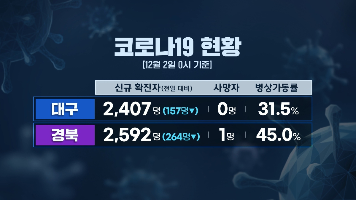 12월 2일 0시 기준 코로나 19 신규 확진자는 대구 2,407명, 경북 2,592명으로, 지난주 같은 요일에 비해 대구는 105명 늘었고, 경북은 229명 줄었습니다.