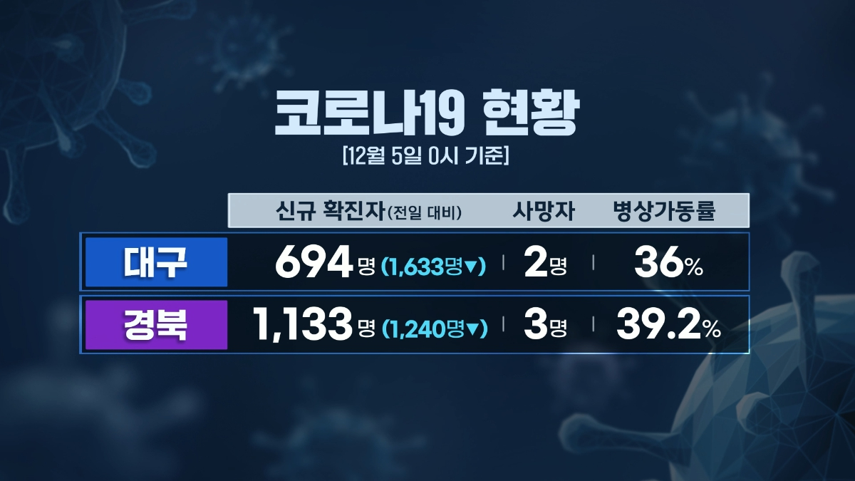 12월 5일 0시 기준 대구의 코로나19 확진자는 694명으로 지난주 같은 요일보다 조금 줄고, 경북 확진자는 1,133명으로 역시 지난주보다 줄었습니다.