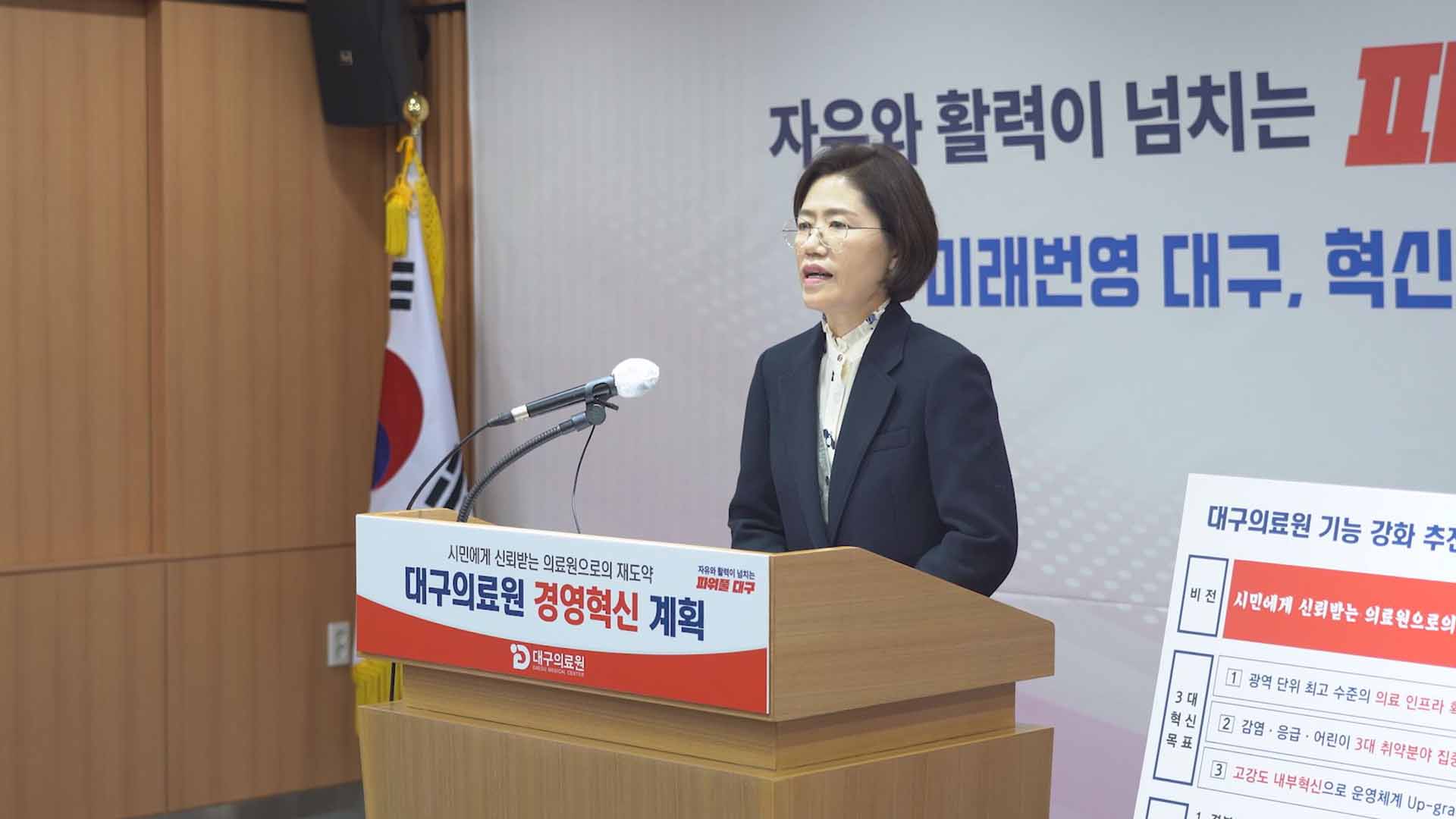 김승미 대구의료원장은 12월 7일 대구시청에서 기자회견을 열어 의료원 기능 강화를 위한 3대 혁신 목표와 8대 추진 과제를 밝혔습니다.