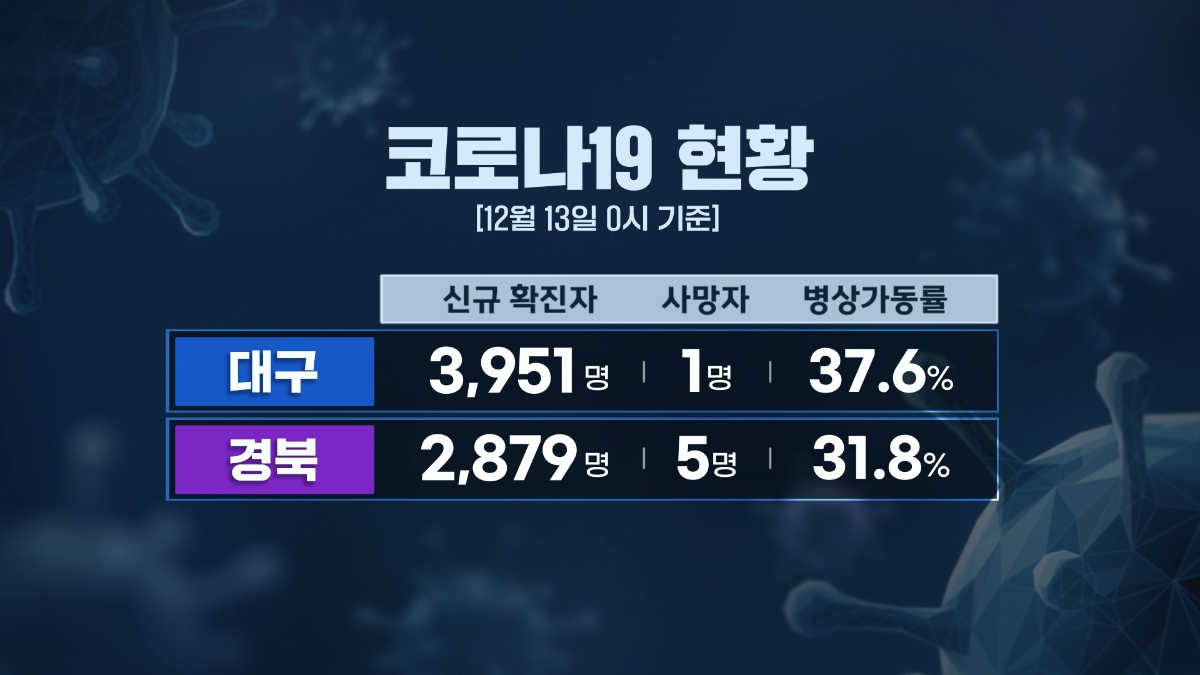12월 13일 0시 기준 코로나 19 신규 확진자는 대구 3,951명, 경북 2,879명으로, 지난주 같은 요일에 비해 대구는 191명, 경북은 139명 늘었습니다.