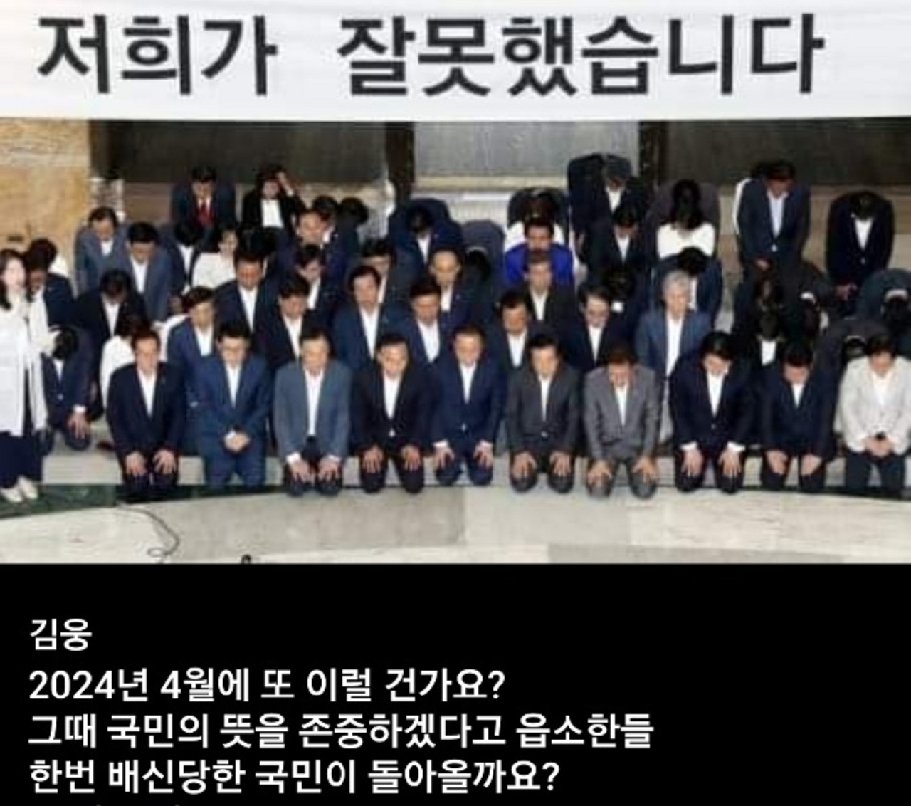 국민의힘 김웅 의원이 12월 19일 비상대책위원회가 당 대표 선출과 관련해 당원 투표 100%로 개정하겠다고 의결한 것과 관련해 2018년 지방선거 대참패 직후 당시 지도부가 무릎 꿇고 사죄한 사진을 올리며 "2024년 4월에 또 이럴 것인가"라고 지적했습니다.
