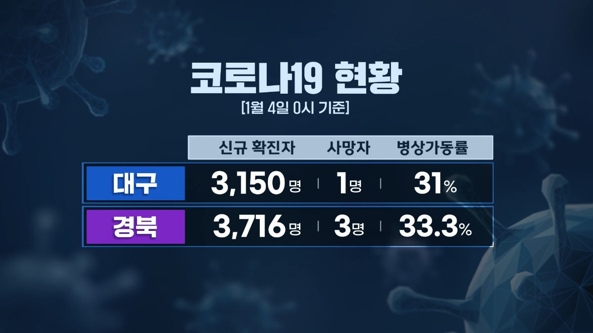 1월 4일 0시 기준 대구의 코로나19 신규 확진자는 3,150명으로 3일보다 조금 늘었고, 경북의 신규 확진자는 3,716명으로 어제보다 많습니다.