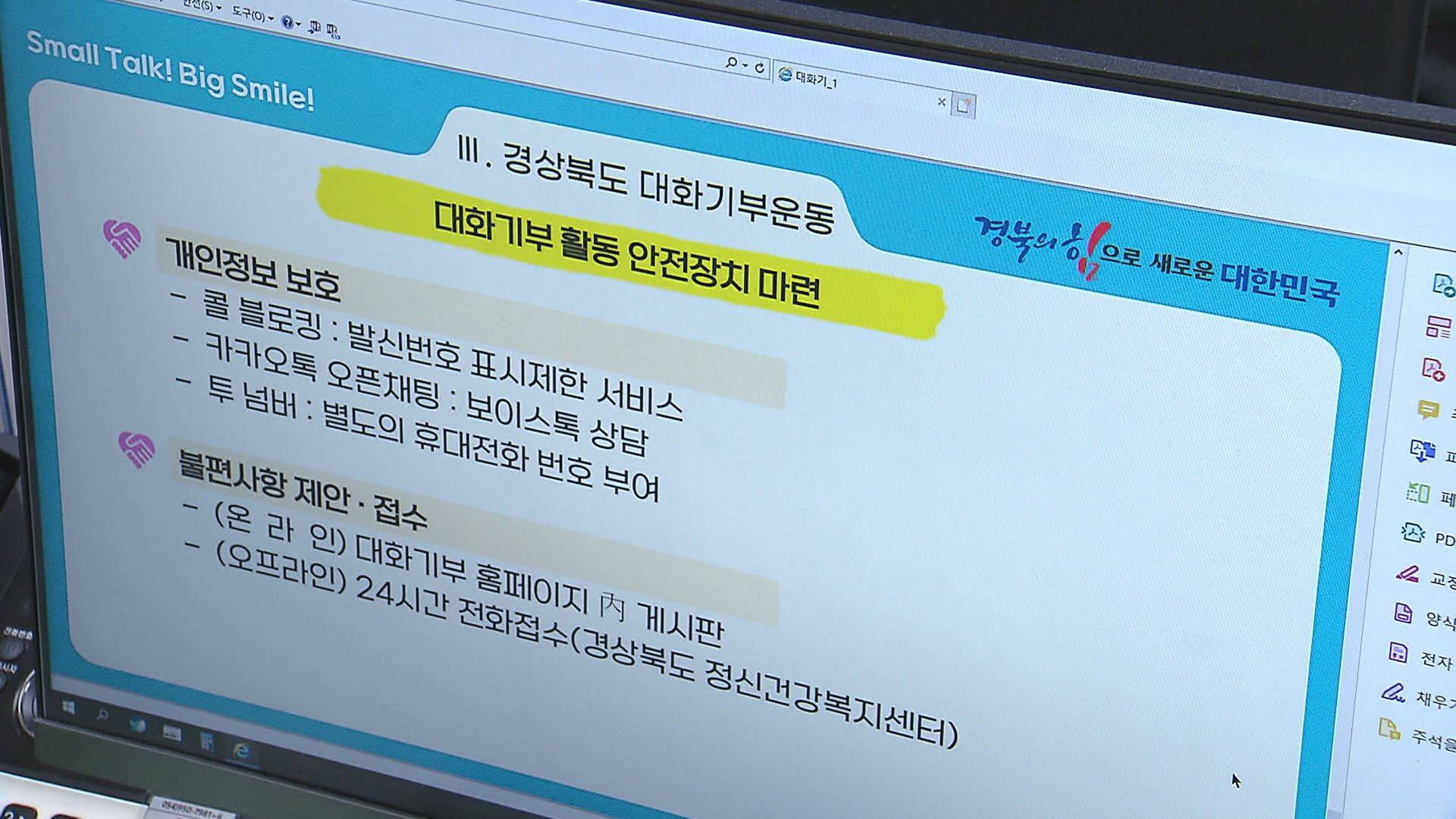 코로나 장기화에다 경기까지 어려워지면서 몸도 마음도 지친 사람들이 늘면서 경상북도가 진행하고 있는 것인데요, 도내 23개 시군별로 자원봉사 경험이나 사회복지사 자격 또는 그에 준하는 경력이 있는 사람 3백여 명을 모집했습니다.