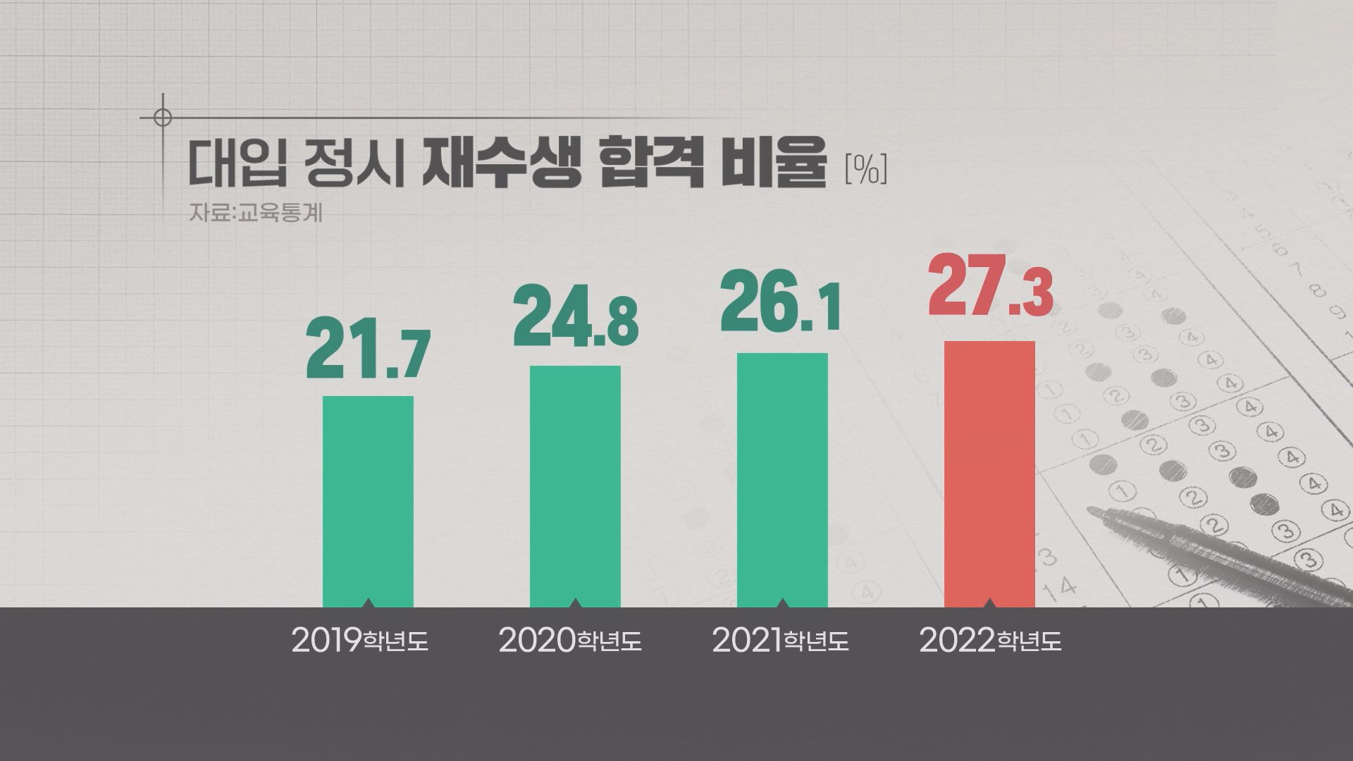 정시에서 재수생 합격 비율은 2019학년도 21.7%에서 해마다 높아져 2022학년도에는 27.3%까지 오르는 등 재수생 강세는 지속적으로 이어지고 있습니다.
