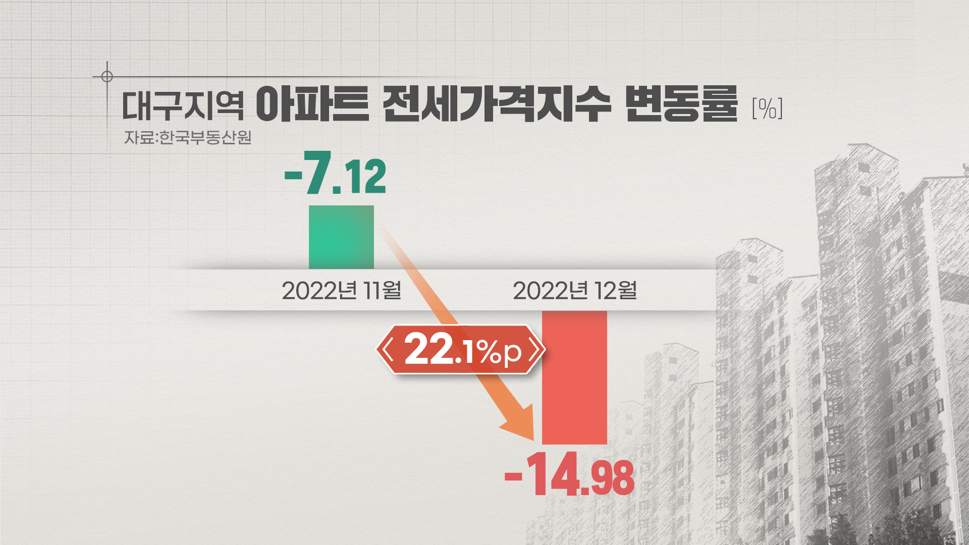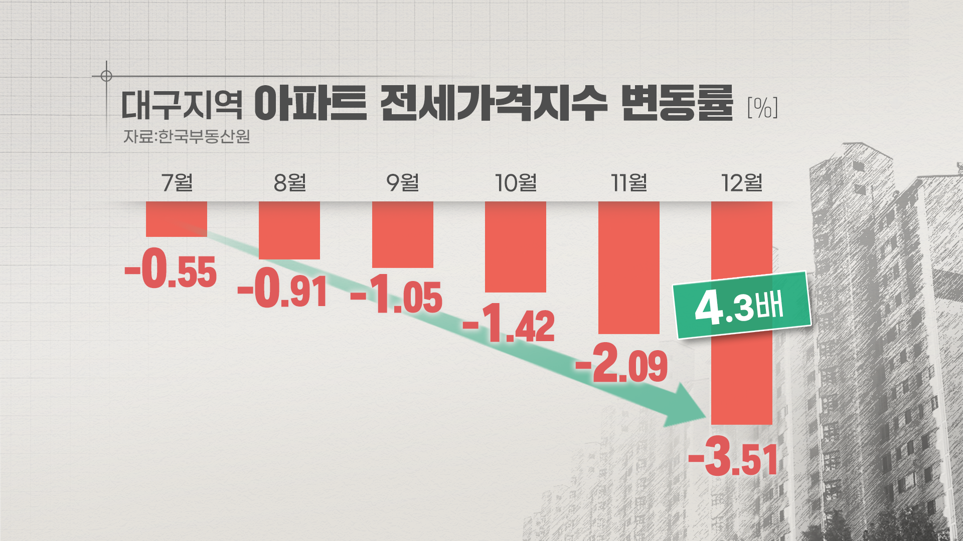 한국부동산원에 따르면 12월 대구지역 아파트 전세 가격지수 변동률은 -4.54%를 기록해 11월의 -2.63%보다 1.91% 포인트 더 떨어졌습니다.