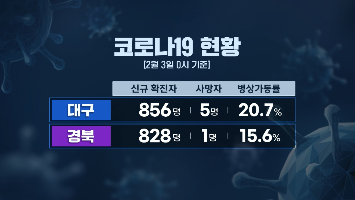2월 3일 0시 기준 코로나 19 신규 확진자는 대구 856명으로, 지난주 같은 요일보다 46.4% 줄었습니다.