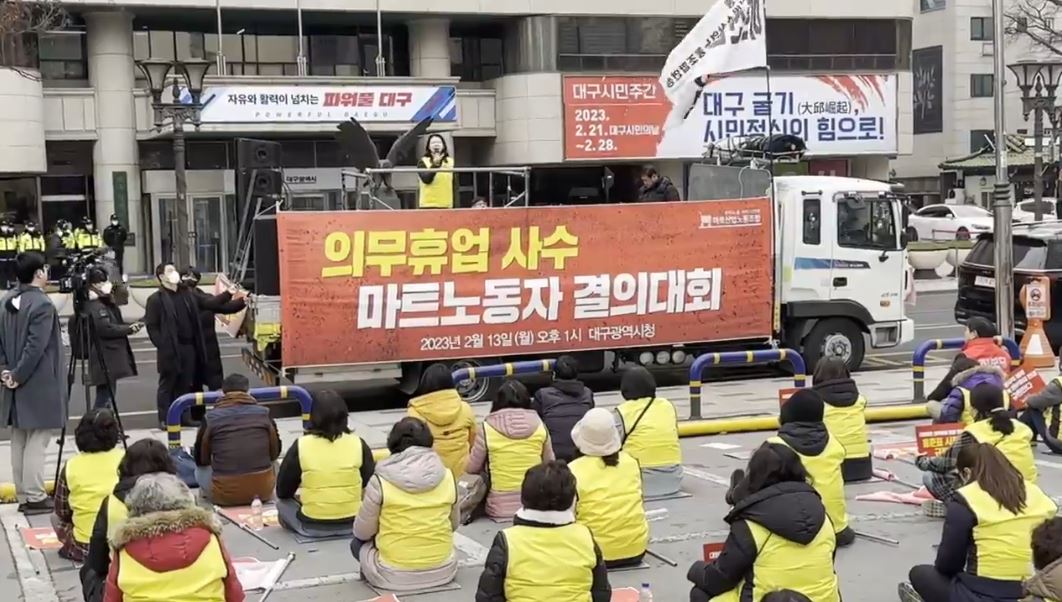대구지역 대형마트 월요일 휴업 첫날, 마트 노조는 2월 13일 대구시청에서 결의대회를 열고 노동자 의견을 묻지도, 듣지도 않은 채 대구시가 의무 휴업일을 바꿨다고 비판했습니다.