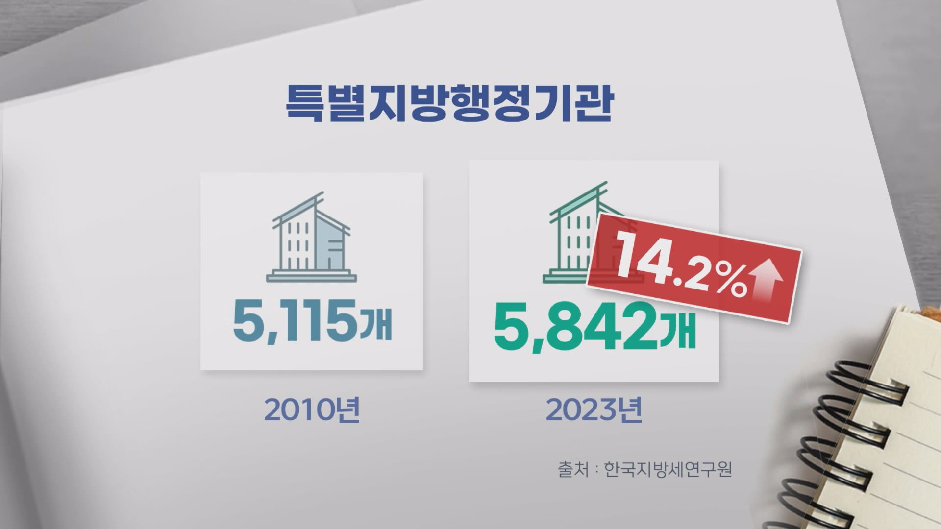 그런데도, 특별지방행정기관은 지난 2010년에 5,115개이던 것이 2023년 1월 기준으로 5,842개로 14.2%나 늘었습니다.