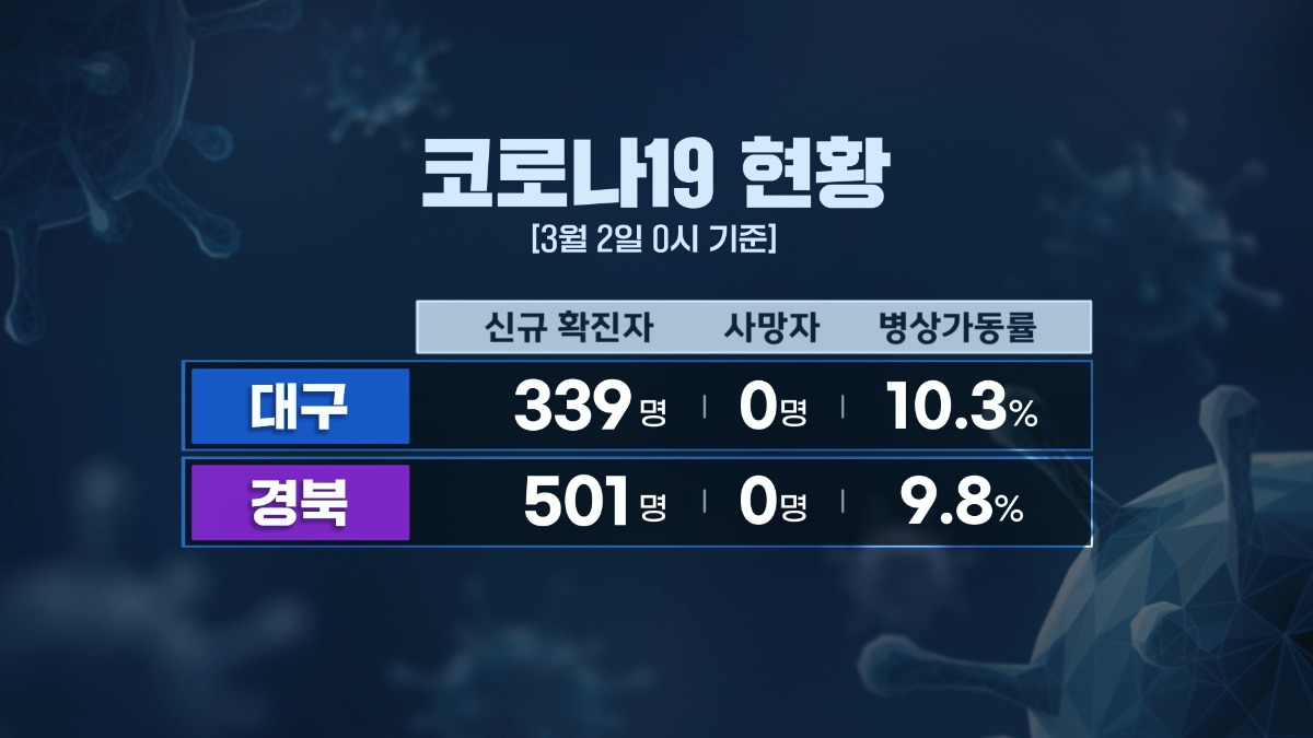 3월 2일 0시 기준 코로나 19 신규 확진자는 대구 339명, 경북 501명으로, 지난주 같은 요일에 비해 대구는 170명, 경북은 165명이나 줄었습니다.