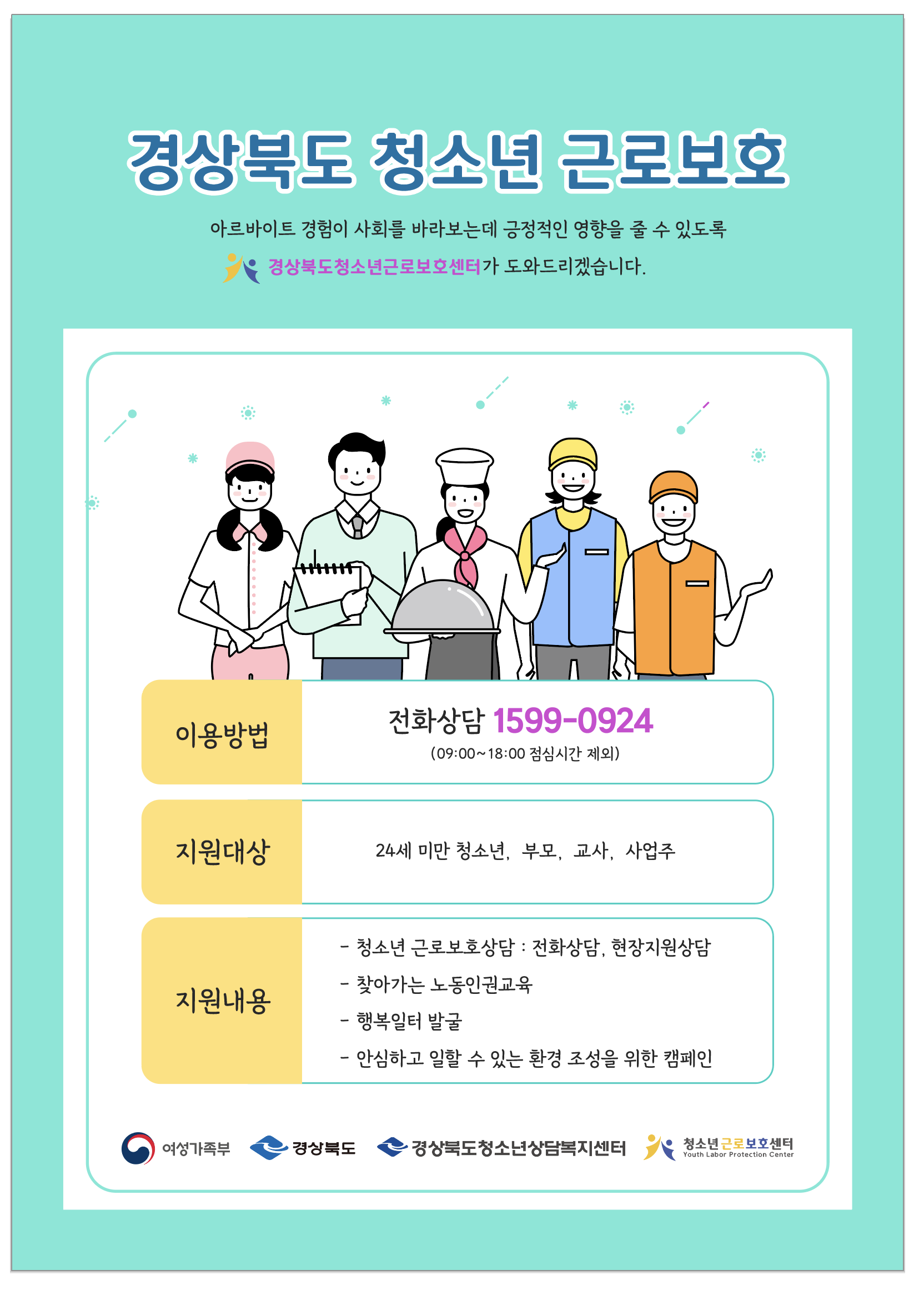근로 청소년의 부당 처우 문제 지원을 위해 상담 전화 1599-0924(평일 09:00~18:00)도 운영하고, 앞으로는 찾아가는 상담·법률 자문도 할 계획이라고 덧붙였습니다.