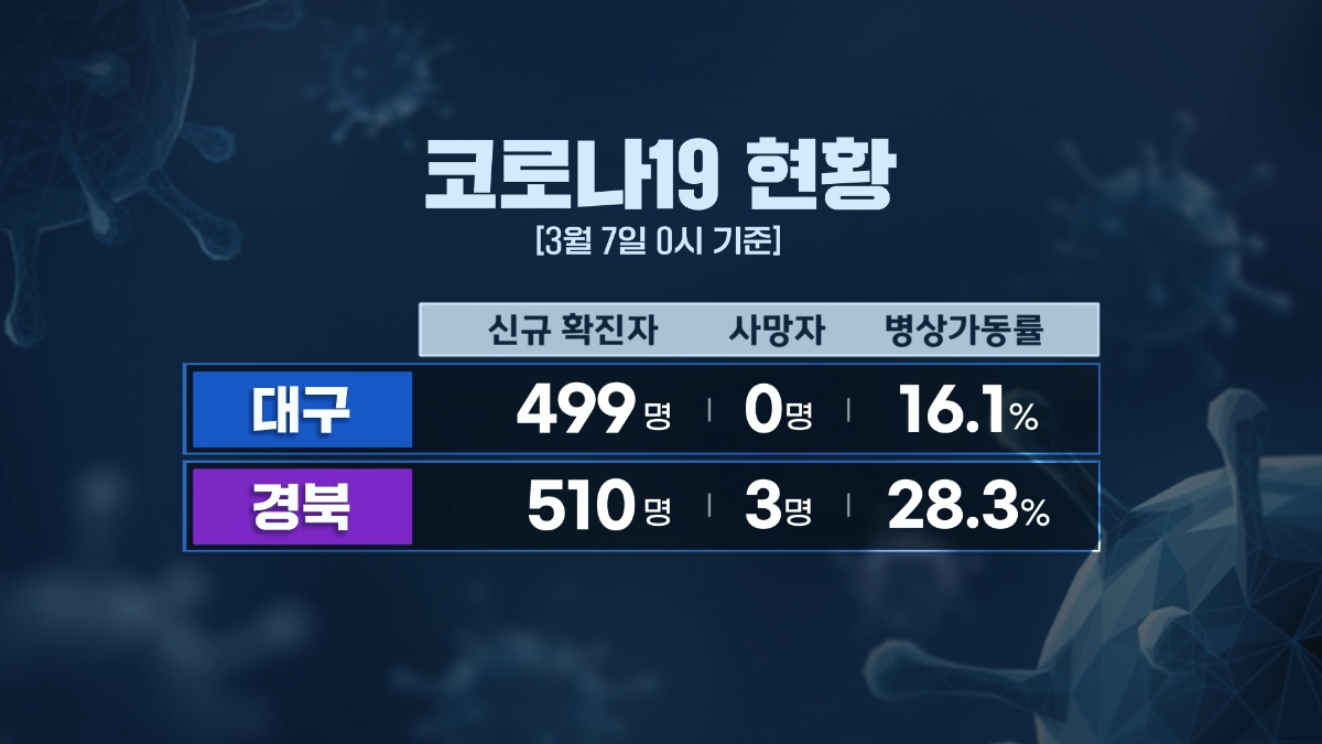 3월 7일 0시 기준 코로나 19 신규 확진자는 대구 499명, 경북 510명으로, 지난주 같은 요일에 비해 대구는 8명, 경북은 29명 줄었습니다.