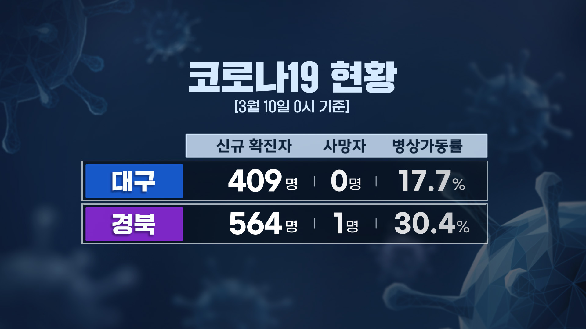 3월 10일 0시 기준 코로나 19 신규 확진자는 대구 409명, 경북 564명으로, 지난주 같은 요일에 비해 대구는 25명 줄어든 반면 경북은 70명 늘었습니다.