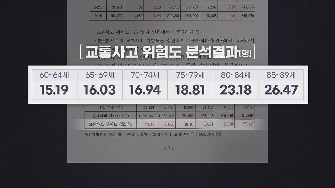 2022년 한 대기업 보험사 연구소는 교통사고 때 심각한 인명피해를 낼 위험도를 수치화해보니, 70세 이상부터 위험도가 급격히 증가했습니다.