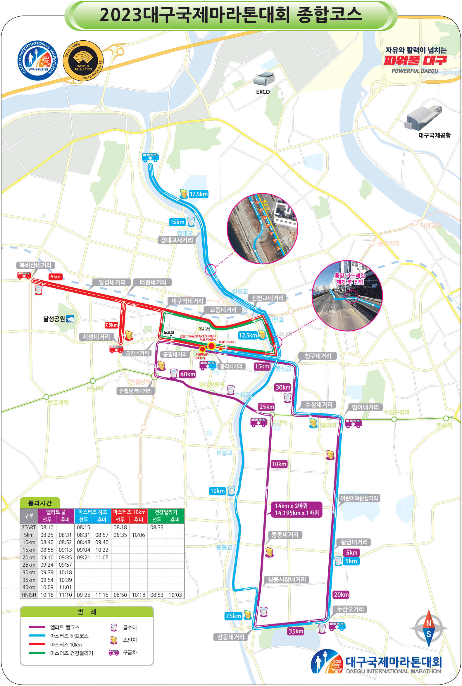 이번 대회는 하프 코스의 도심지 구간을 신천동로로 우회하면서 시민 불편을 줄였고 대회 코스로 막혀버린 대구은행과 들안길 삼거리 구간은 무료 셔틀버스를 운영합니다.