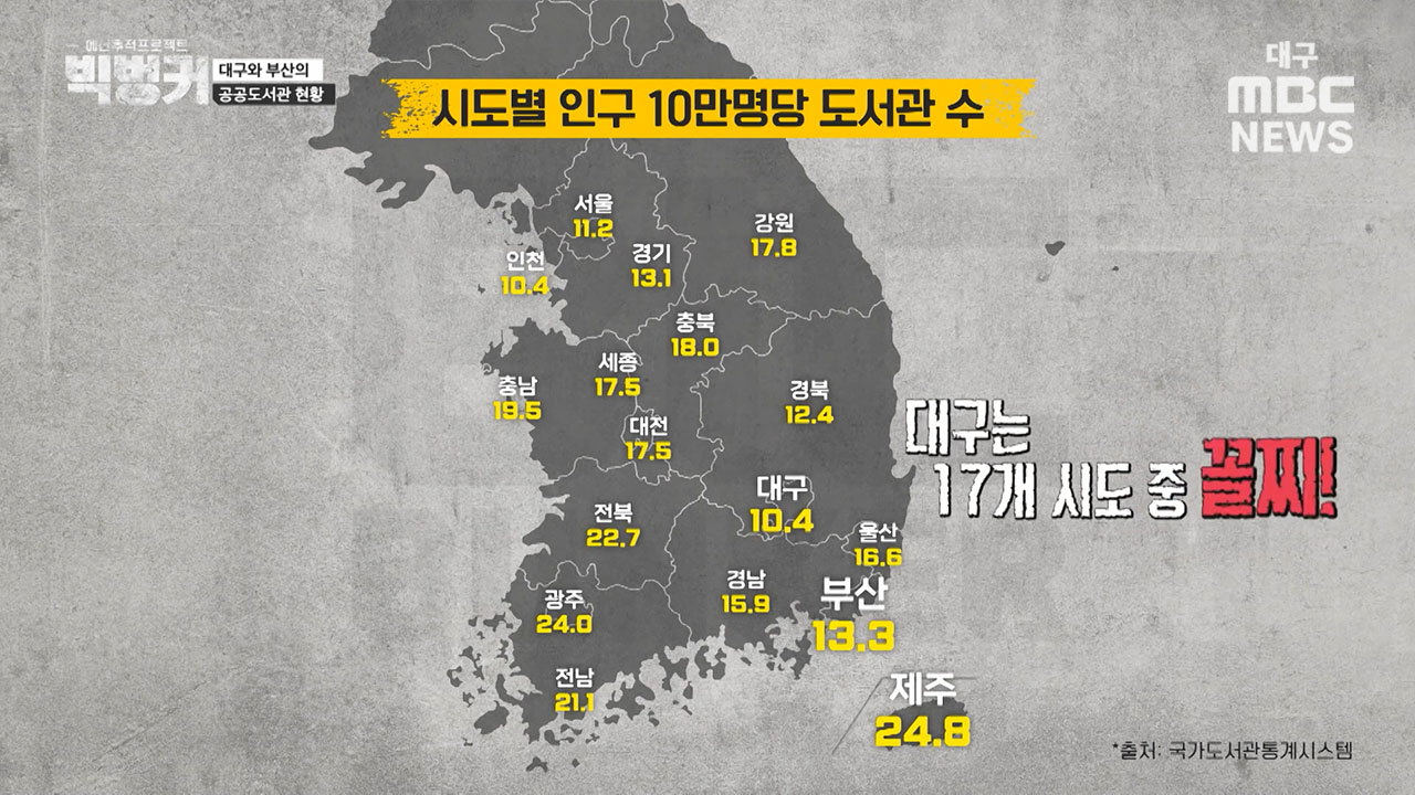 그랬더니 인구 10만 명당 도서관이 가장 많은 지역은 24.8개 관으로 제주가 가장 많았고, 부산은 10만 명당 13.34개 관으로 17개 시도 중 12위였습니다. 대구는 인구 10만 명당 10.44개 관으로 17개 시도 중 꼴찌를 차지했습니다.