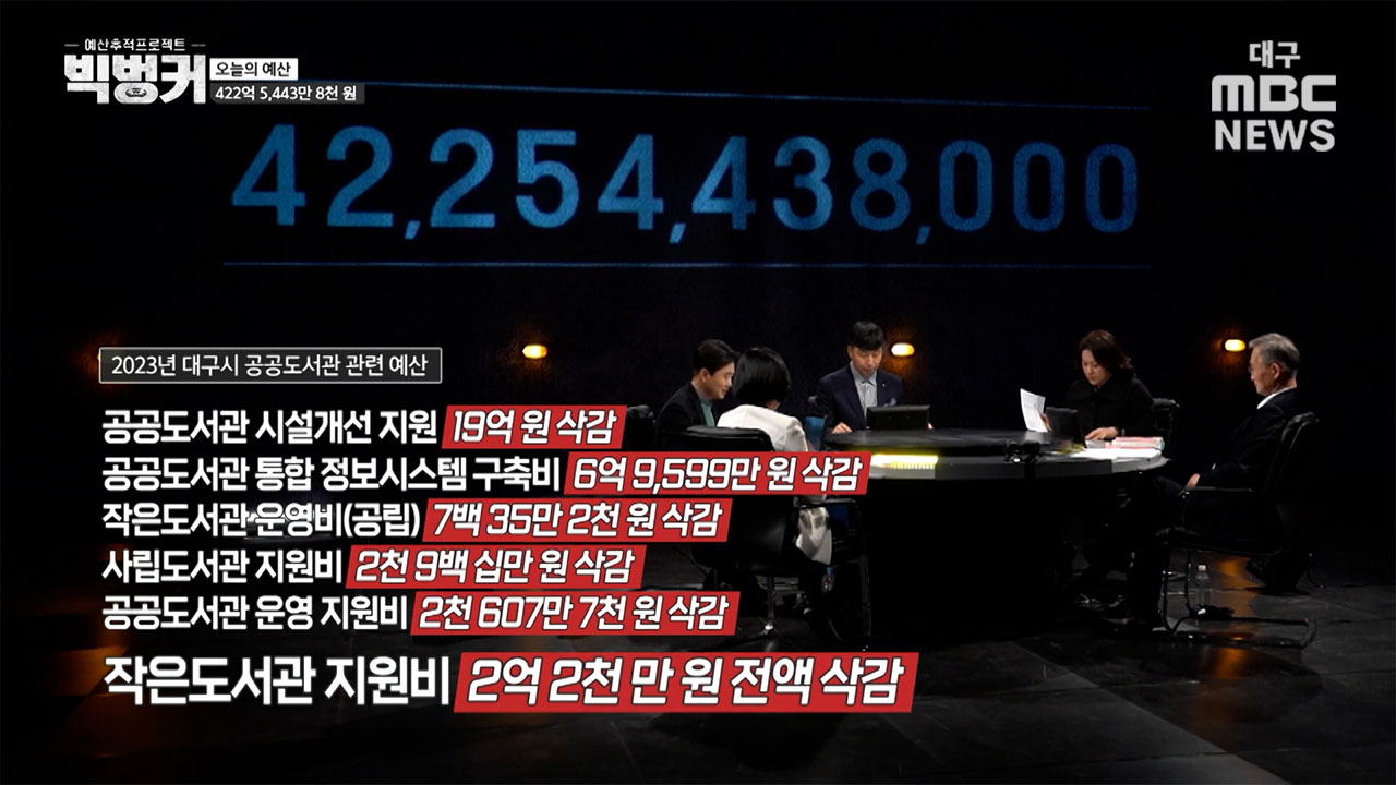 우지영 나라살림연구소 수석연구위원 "2023년 대구의 사립 작은도서관은 211관인데요, 2022년의 예산 2억 2천만 원은 도서관 한 곳이 아닌 우수한 작은도서관들 위주로 나누어주는 돈이었어요. 나누면 한 도서관에 1년 1~200만 원 정도가 지원된다는데 장서 구입비 정도로 활용됐습니다. 그런데 2023년에는 0원, 전액 삭감이 된 거죠"