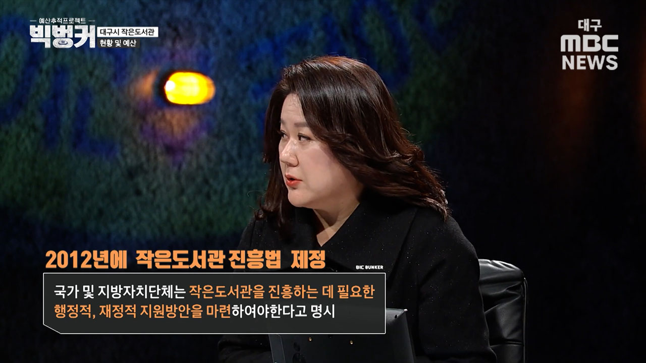 우지영 나라살림연구소 수석연구위원 "대구의 경우 그전까지 작은도서관 지원은 대구시와 구군이 함께했는데요, 이번에 대구시가 작은도서관 예산을 전액 삭감하면서 그 역할을 이제 구·군이 전담하게 됐습니다.