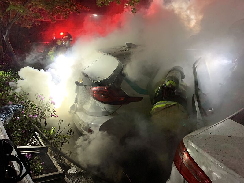 이 불로 전기차와 주변에 주차된 차량 2대가 모두 불에 타 소방서 추산 2천 700만 원의 재산 피해가 났습니다.