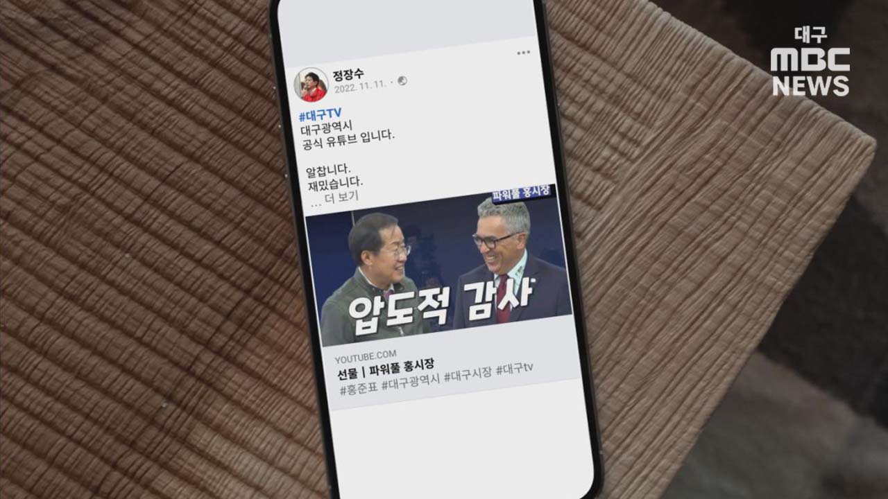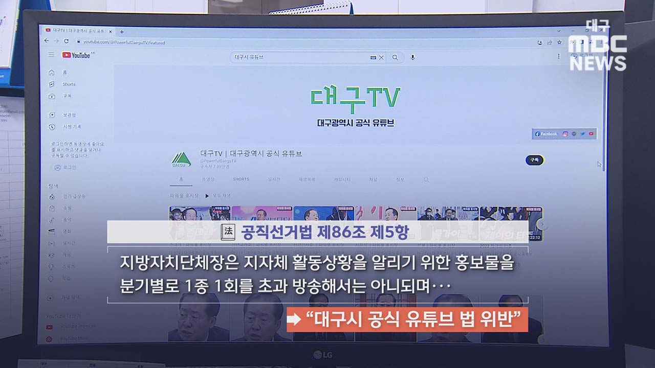 홍준표 시장은 대구 공식 유튜브인 대구TV를 통해 업적을 홍보하고, 파워풀 홍시장과 쇼츠 영상 코너에 시정 홍보가 아닌 홍 시장 개인 위주의 홍보를 했습니다. 공직선거법 제86조 5항에는 지방자치단체의 아무리 중요한 업적이나 사업계획이라도 분기별로 1종 1회를 초과해 홍보해서는 안 되는 것으로 나와 있습니다.