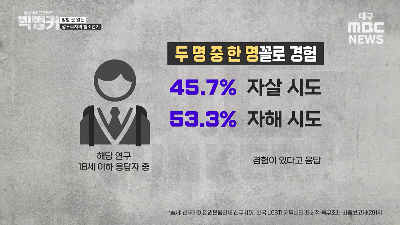 친구들로부터, 하물며 교사에게서도 자신의 존재를 부정당하거나 혐오를 당하는 청소년 성소수자들이 결국 선택하는 길은 무엇일까요? 한국게이인권운동단체 친구사이에서 한 조사에 따르면 18세 이하 성소수자 45.7%가 자살을 시도했었고, 53.3%가 자해 시도 경험이 있다고 응답했습니다. 아이들의 생존 문제까지도 직결되는 상황이라는 이야기입니다.