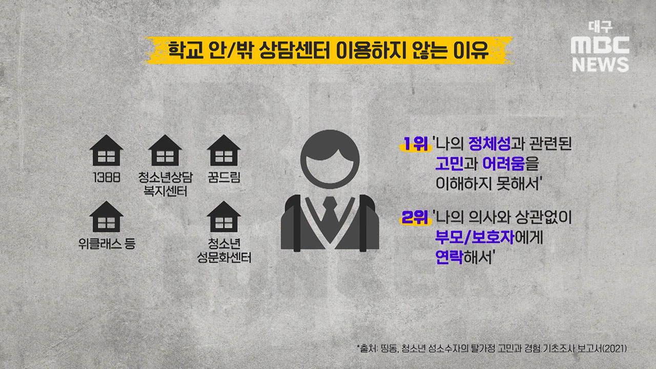 정민석 청소년성소수자지원센터 띵동 대표 "저희 '띵동'에서 해당 내용에 대해 조사한 적이 있었습니다. 아이들에게 청소년 상담 기관을 왜 이용하지 않냐고 물었더니 첫째로는 '나의 정체성과 관련된 고민과 어려움을 이해하지 못해서'라고 답했고요, 두 번째로는 '나의 의사와 상관없이 부모나 보호자에게 연락을 해서'라고 답변했어요"