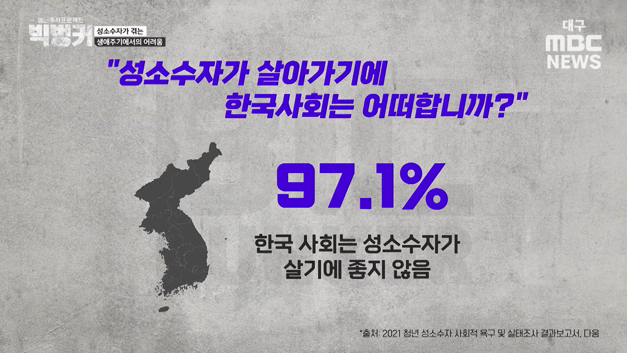정민석 청소년성소수자지원센터 띵동 대표 "청년 성소수자에게 성소수자로 살아가기에 한국 사회는 어떠냐고 물어본 적이 있는데요, 매우 안 좋다가 56.1%, 다소 안 좋다 41%로, 97.1%가 한국 사회는 성소수자가 살기 좋지 않다고 부정적으로 응답했습니다"