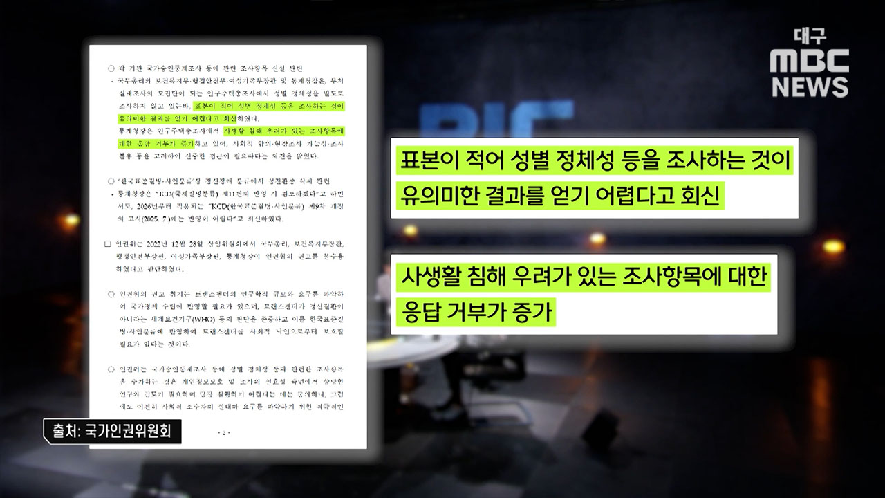 우지영 나라살림연구소 수석연구위원 "심지어 2022년 3월에 국가인권위원회에서 성소수자 인구 규모 등의 실태를 파악하라는 권고를 보건복지부, 행정안전부, 통계청에 내린 적이 있는데요, 권고를 받은 관계부처 모두 불수용 의사를 밝혔습니다. 그 이유로는 '인구 조사에서 성별 정체성을 조사하는 건 표본이 적어 유의미한 결과를 얻기 어렵다' '사생활 침해 우려가 있는 항목은 응답 거부가 증가하고 있어서 어렵다'라고 말했습니다. 실태 조사가 모든 것의 시작이라고 할 수 있잖아요? 이걸 해야, 성소수자가 겪는 차별과 어려움이 무엇인지 조사를 해야 그 결과가 어떤 정책으로든 번영될 수 있는 거고요. 그런데 이런 관계부처의 미온적인 태도만 봐도 관련 예산이 '0원'인 이유를 설명해 준다고 생각합니다"