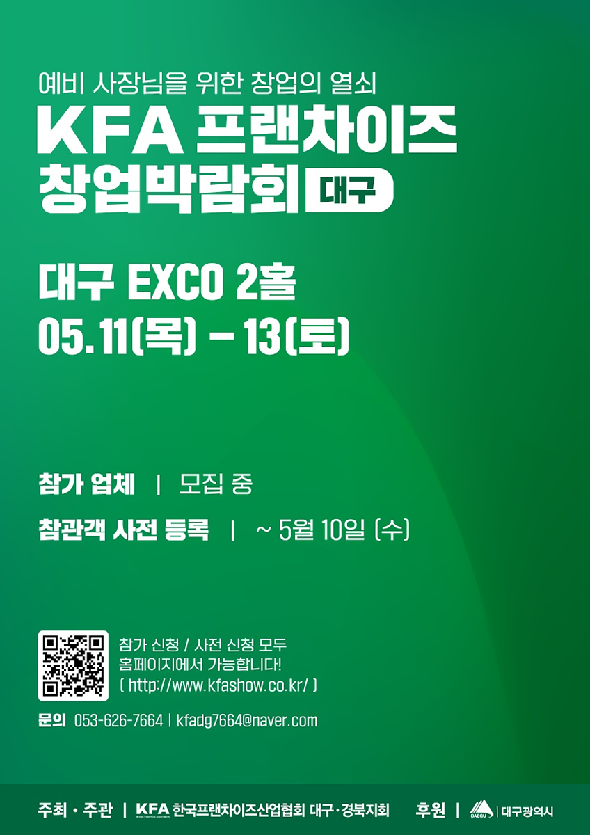 프랜차이즈 창업 정보를 제공하는 '2023 프랜차이즈 대구 박람회'가 오는 5월 11일부터 사흘 동안 엑스코에서 열립니다.