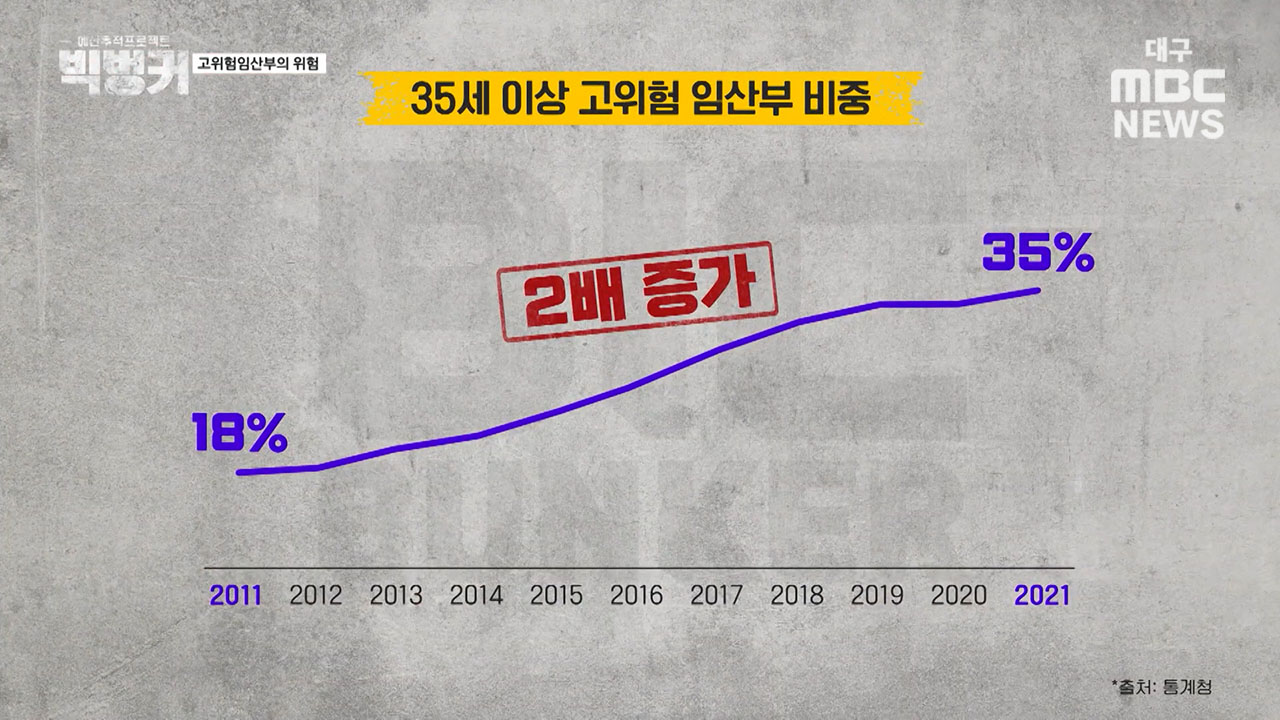 배주현 매일신문 기자 "고위험 임산부에 속하는 만 35세 이상 임산부의 비중은 2011년 18%에서 2021년 35%로 10년 사이에 거의 두 배가 늘었어요. 그리고 한 여성병원의 조사에 따르면 고위험 요인을 가진 산보가 2010년 19.8%에서 2017년 42.1%로 두 배 이상 증가했다고 합니다. 이런 자료를 보면 고위험 산모는 계속 증가 추세에 있다고 보입니다"