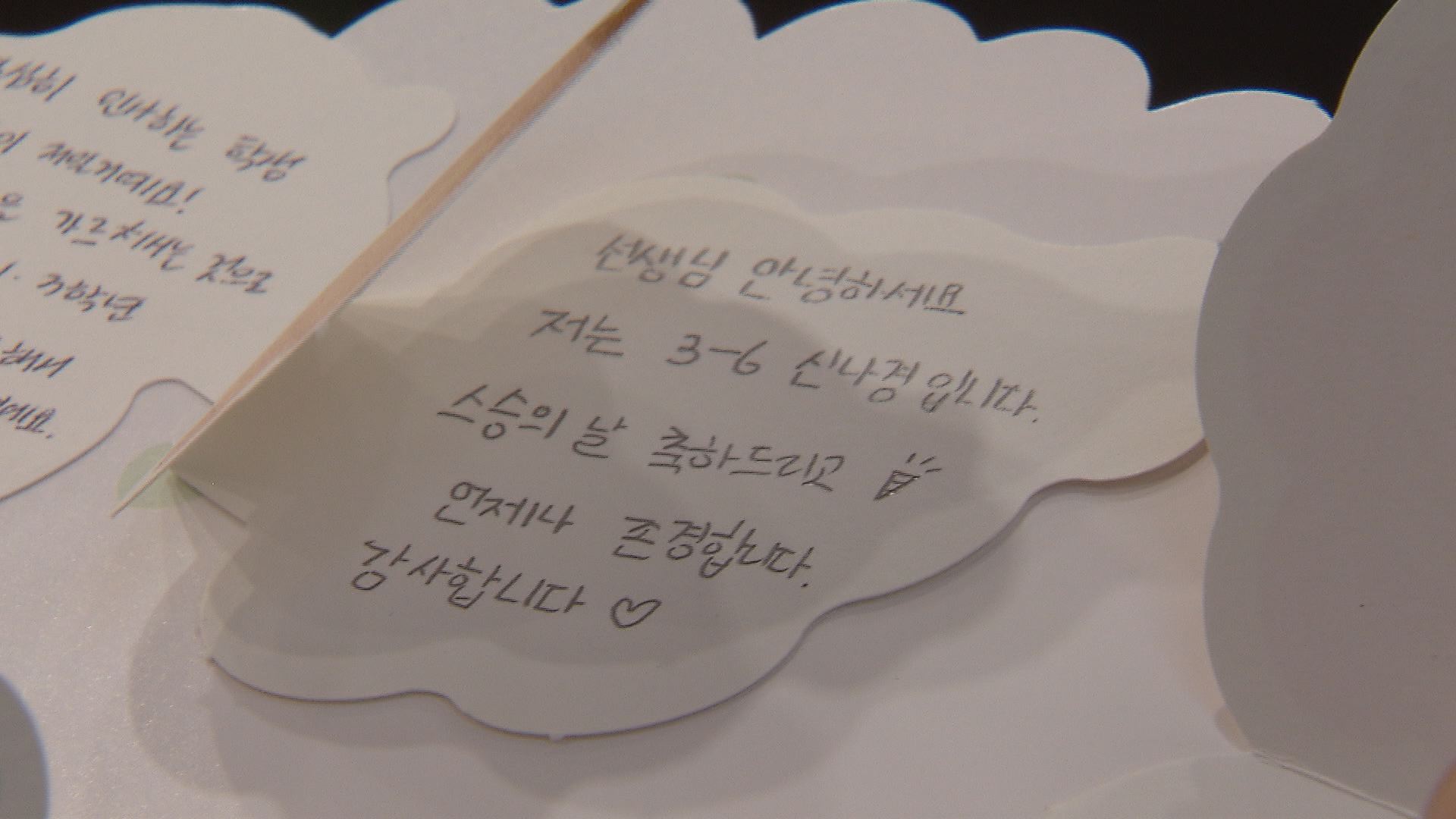 선생님께 수줍게 건넨 꽃다발 편지지에는 학생들의 손 편지로 빼곡했습니다.