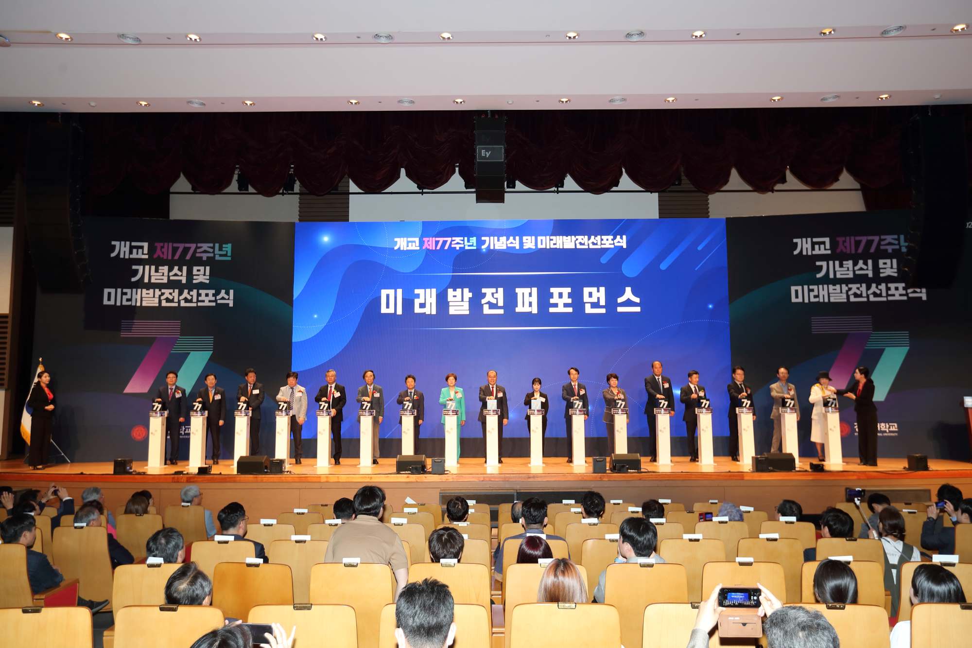 경북대학교는 5월 19일 오후 글로벌플라자에서 학생과 교수, 동문 등 500여 명이 참석한 가운데 '개교 77주년 기념식'과 '미래 발전선포식'을 열었습니다.