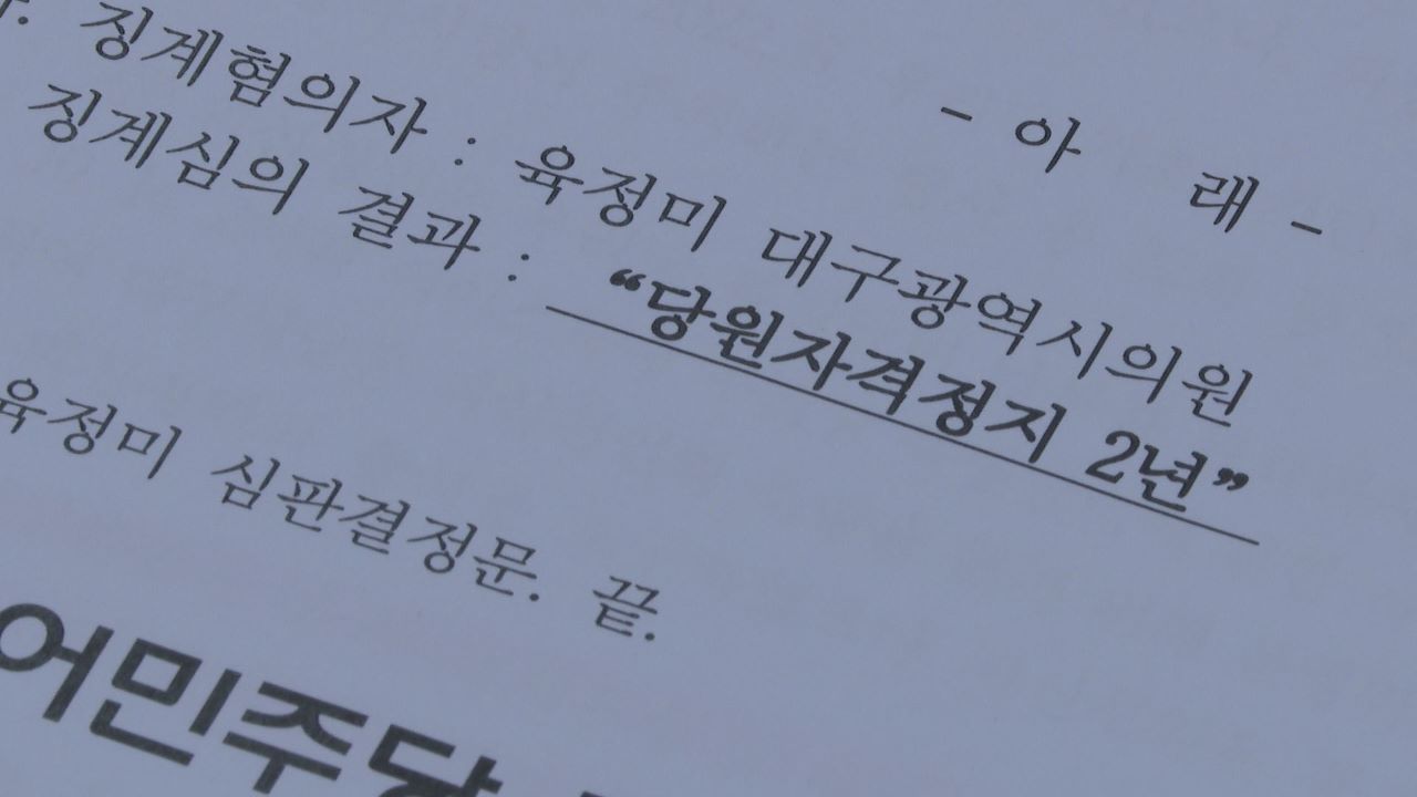 대구시의회에서 유일한 야당 의원인 더불어민주당 육정미 의원이 '당원권 정지 2년'이라는 중징계를 받았습니다.