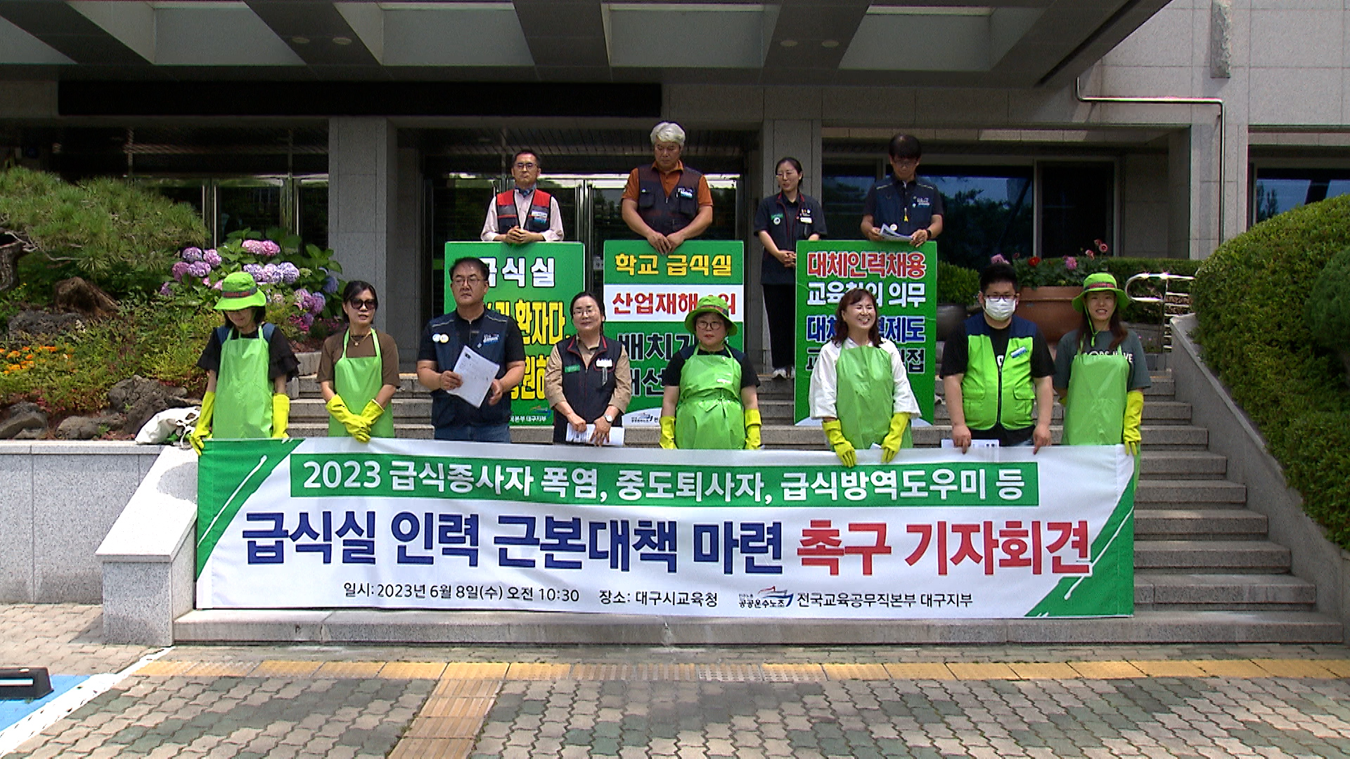 민주노총 전국교육공무직본부 대구지부는 6월 8일 대구시 교육청 앞에서 기자회견을 열고 학교 급식실 종사자 인력 충원 근본 대책 마련을 촉구했습니다.