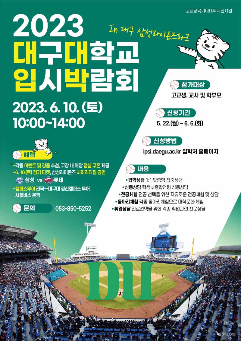 대구대학교가 6월 10일 오전 10시부터 오후 2시까지 삼성라이온즈파크에서 입시박람회를 엽니다.