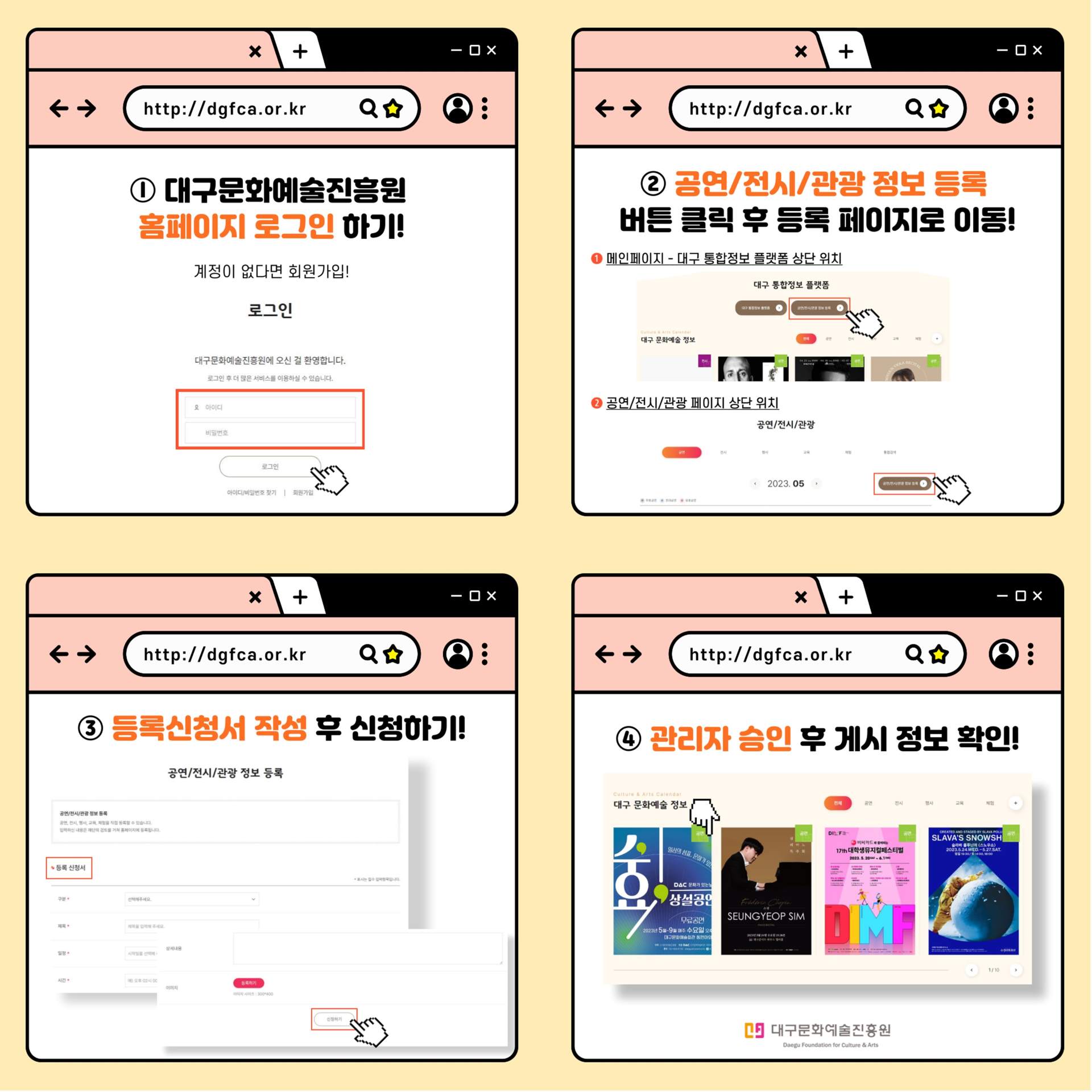 각종 공연, 전시, 교육, 체험 일정을 이용하고 싶은 사람은 등록 신청하고 관리자 승인을 받은 뒤 이용할 수 있습니다.