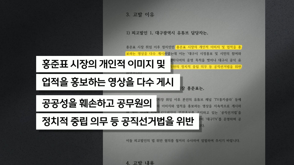 지난 2월에 대구참여연대가 대구시의 공식 유튜브 채널 '대구TV'을 홍 시장 개인 홍보 매체로 전락시켰다며 홍 시장과 유튜브 담당자를 공직선거법 위반 혐의로 고발했습니다.
