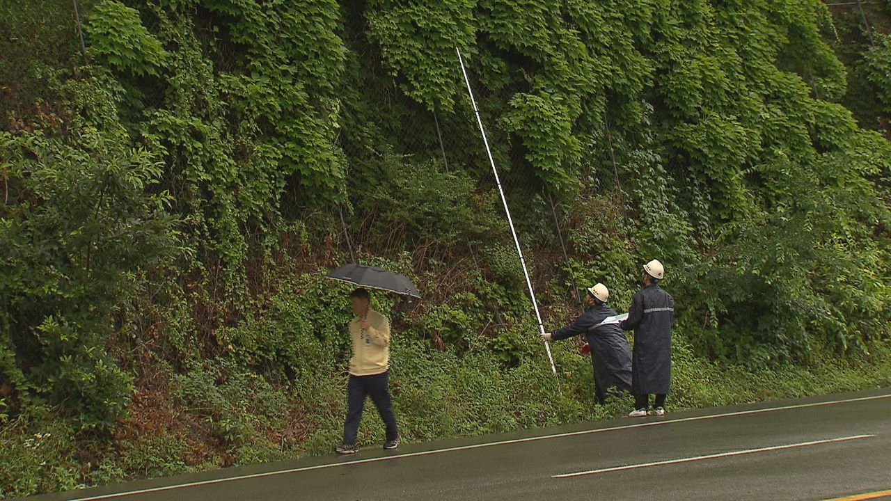 경산시 남천면의 한 국도변에서 50도가 넘는 급경사지 각도를 측정하고, 낙석 방지책이 느슨하진 않은지 암벽 사이로 빗물이 흘러내리는 지도 살펴봅니다.
